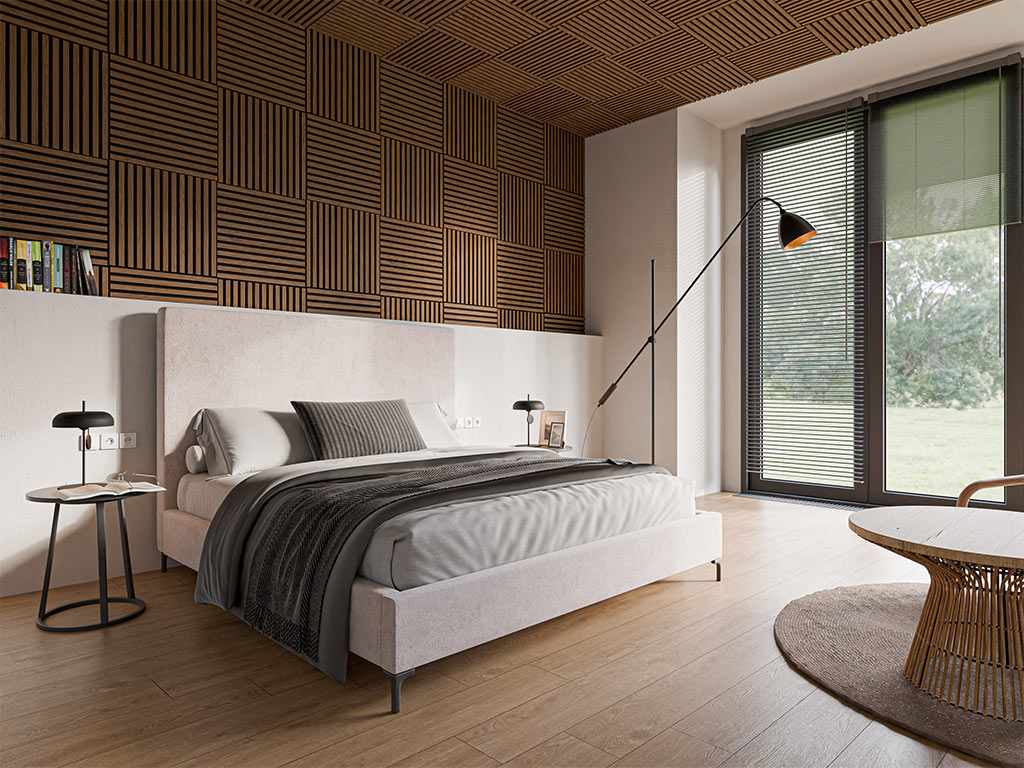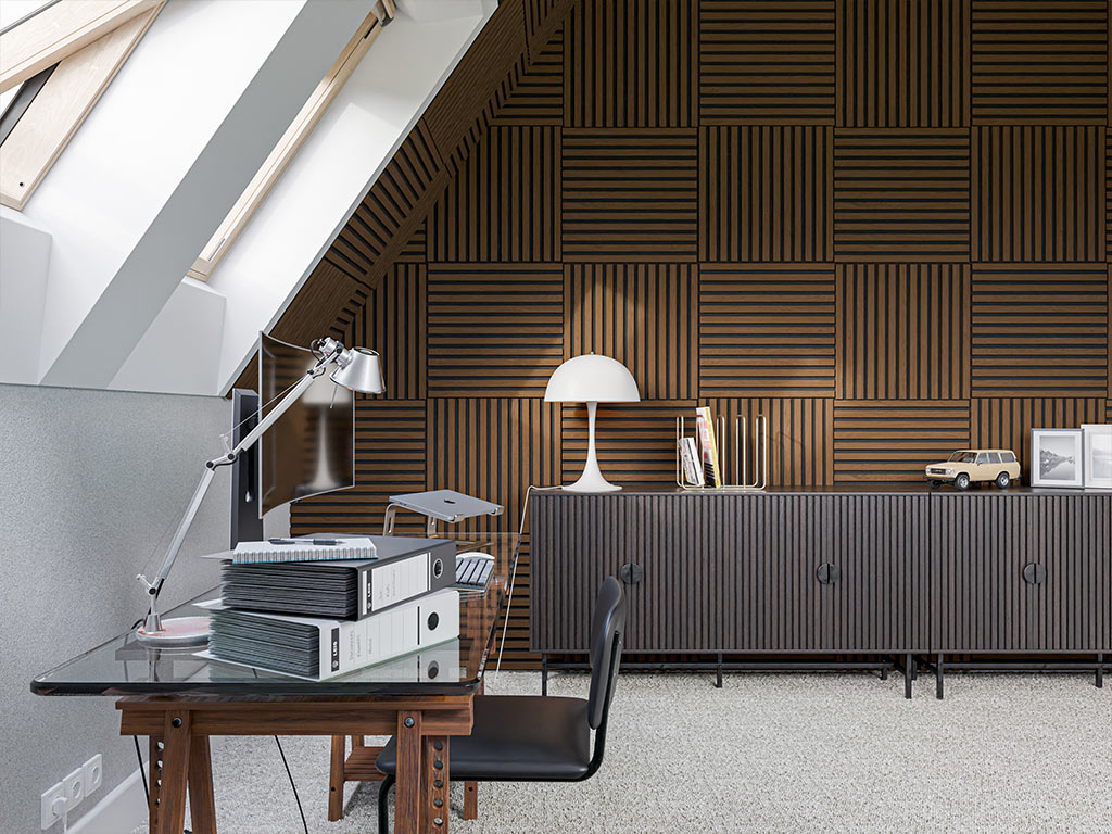 De panelen bestaan uit een dragerplaat met daarop lamellen van hout. Deze doordachte structuur zorgt voor een optimale akoestische regulering en demping van de galmtijd.