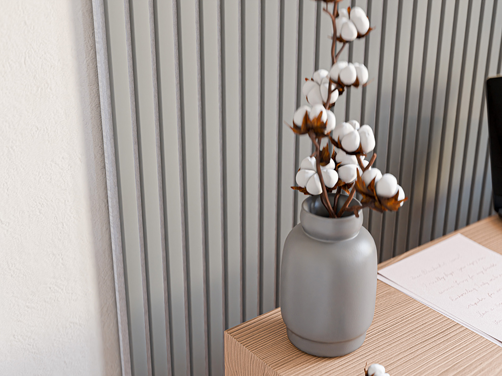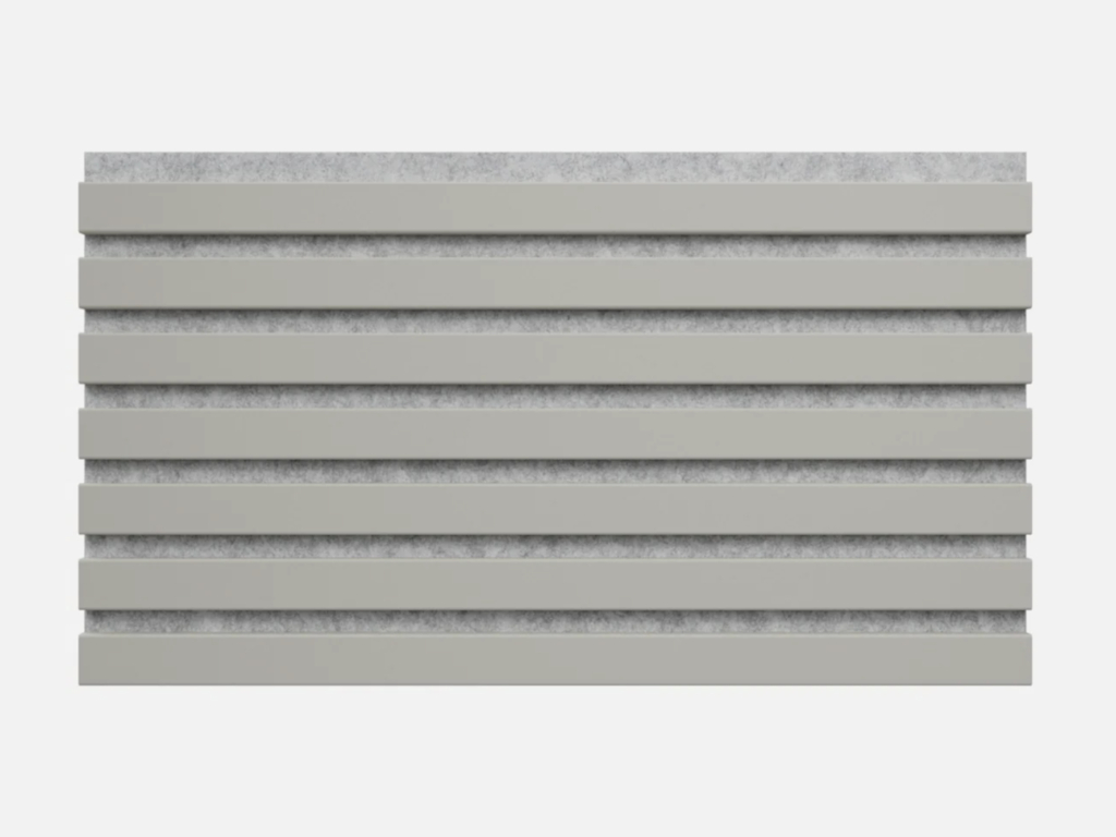 De panelen bestaan uit een 9 mm dikke, lichtgrijze vilt-draagplaat, waarop 10 mm dikke lamellen van hout/MDF zijn aangebracht. Deze doordachte structuur zorgt voor een optimale akoestische regulering, effectieve geluidsabsorptie en minder galm in de ruimte.