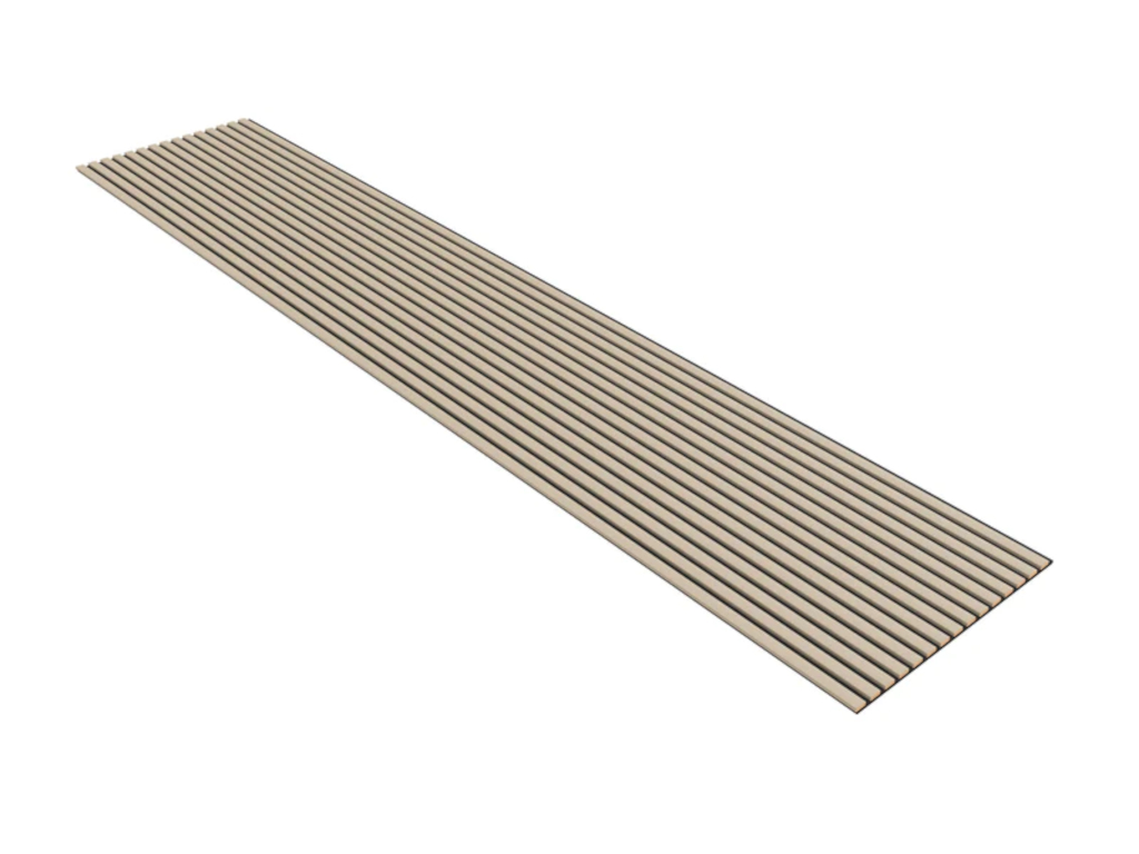 De panelen zijn opgebouwd uit een zwarte vilt-draagplaat, waarop lamellen van FSC-gecertificeerd MDF met een laminaat-oppervlak zijn aangebracht. Deze doordachte structuur zorgt voor optimale geluidsabsorptie, akoestisch comfort en regulering van de galmtijd. Het laminaat maakt de panelen bovendien langdurig bestand tegen vuil, vocht en licht, zodat ze hun kleur en moderne uitstraling lang behouden zonder te verbleken.