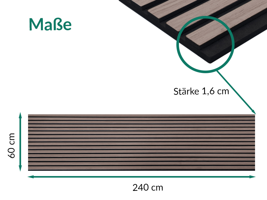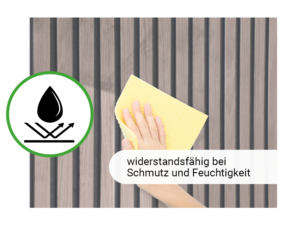 De panelen bestaan uit een eenzijdig gefineerd draagpaneel van zwart vilt, waarop 6 mm dikke MDF-lamellen zijn aangebracht. Deze bijzondere structuur maakt een optimale akoestische regulering en nagalm demping mogelijk.