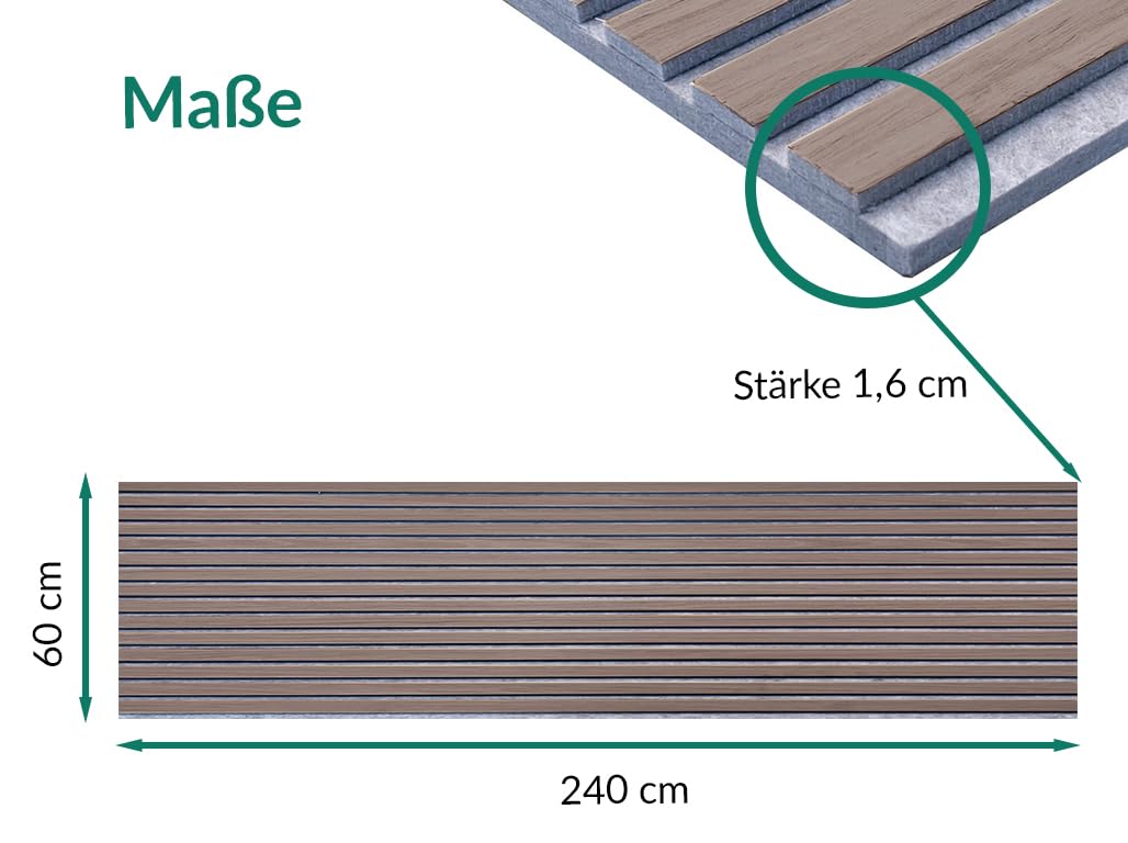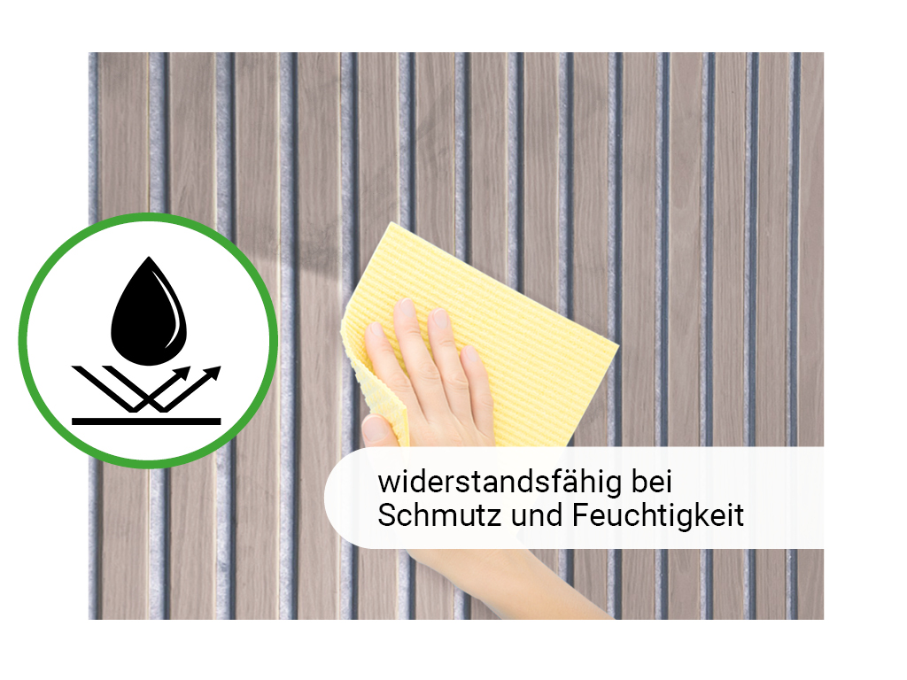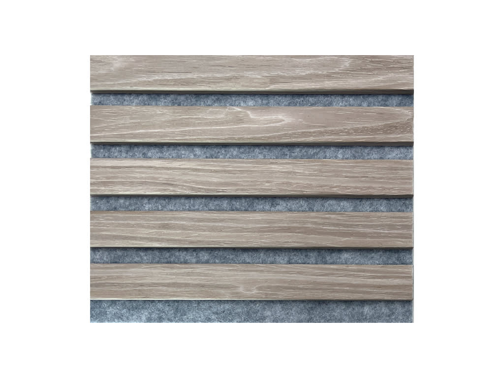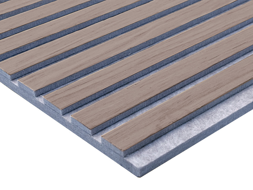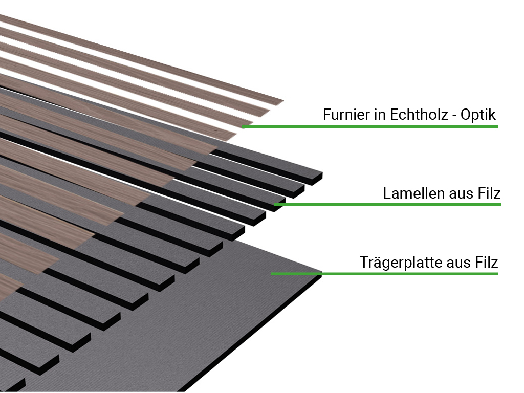 De panelen bestaan uit een eenzijdig gefineerde draagplaat van grijs vilt, waarop 6 mm sterke MDF-lamellen zijn aangebracht. Deze bijzondere structuur maakt een optimale akoestische regulering en nagalm-demping mogelijk.