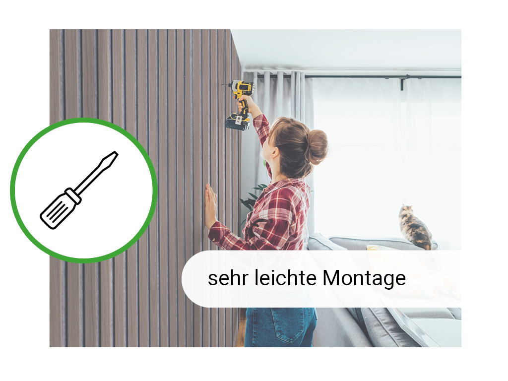 De akoestische panelen worden als volledige platen geleverd, wat de installatie zeer eenvoudig maakt – ze kunnen in een handomdraai aan muren of plafonds worden gemonteerd. Bepaal eerst in welke richting je de panelen wilt aanbrengen en snijd ze indien nodig op maat. Vervolgens aan de muur schroeven of lijmen – klaar!