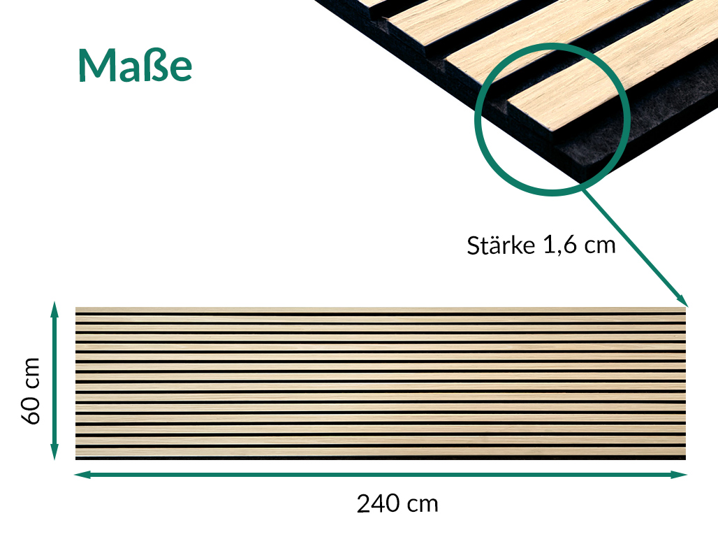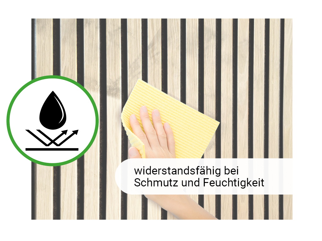 De panelen bestaan uit een eenzijdig gefineerde dragerplaat van zwart vilt, met daarop 6 mm dikke MDF-lamellen. Deze bijzondere structuur maakt een optimale akoestische regulering en nagalmreductie mogelijk.