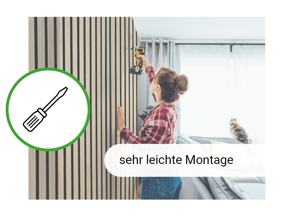 De akoestische panelen worden als hele platen geleverd, wat de installatie uiterst eenvoudig maakt – ze kunnen in een handomdraai aan muren of plafonds worden gemonteerd. Bepaal eerst in welke richting je de panelen wilt aanbrengen en kort ze indien nodig in. Vervolgens aan de wand schroeven of lijmen – klaar!