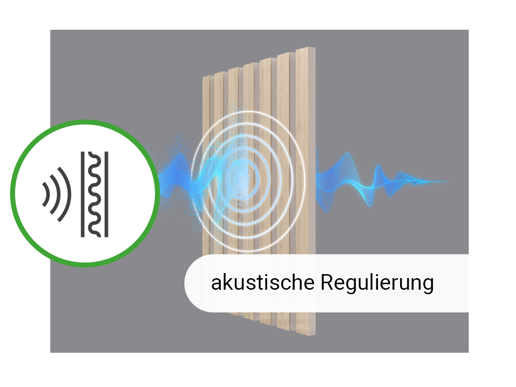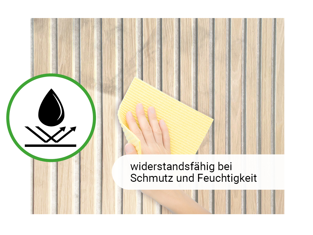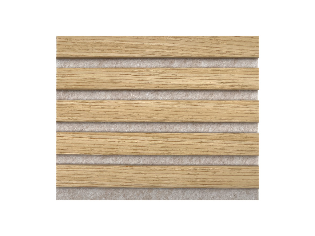 De panelen bestaan uit een eenzijdig gefineerde draagplaat van beige vilt, waarop 6 mm dikke MDF-lamellen zijn aangebracht. Deze bijzondere structuur zorgt voor een optimale akoestische regulering en nagalmreductie.