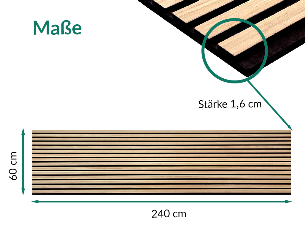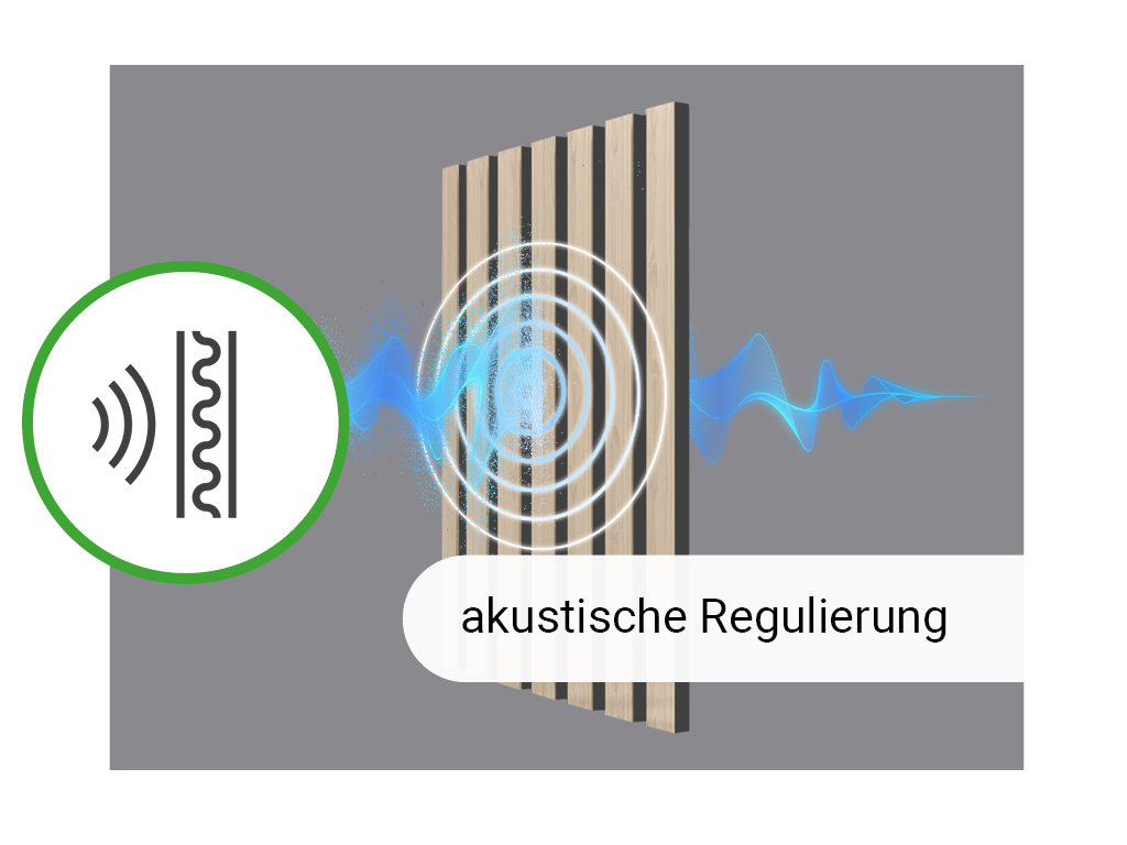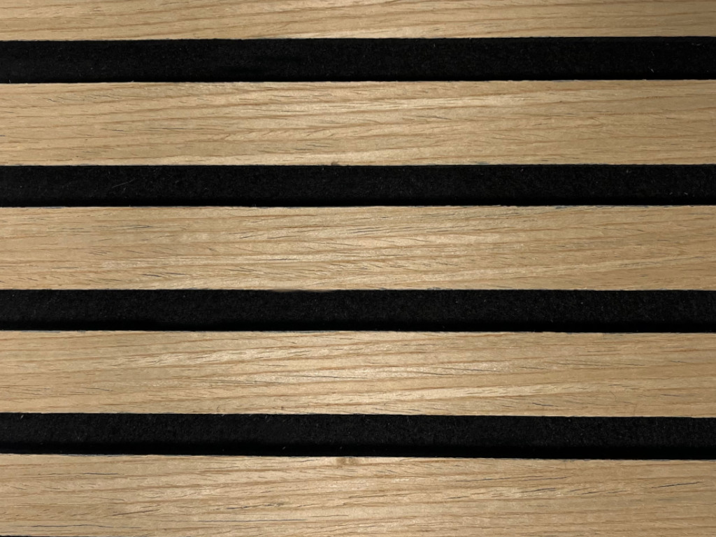 De panelen bestaan uit een eenzijdig gefineerde dragerplaat van zwart vilt, waarop 6 mm sterke MDF-lamellen zijn bevestigd. Deze bijzondere structuur maakt optimale akoestische regulering en nagalmvermindering mogelijk.