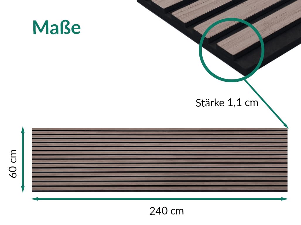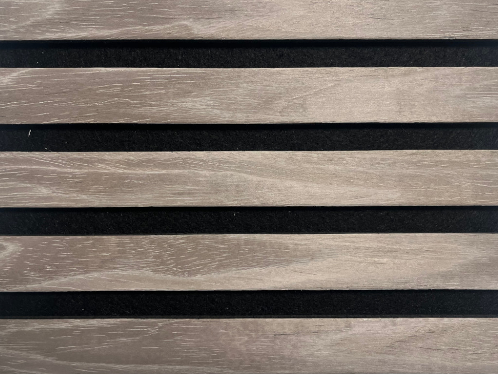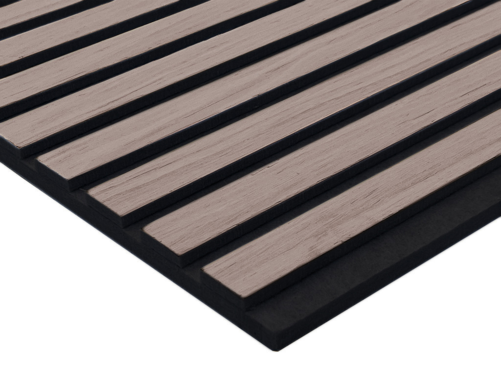 De panelen bestaan uit een 5 mm dikke dragerplaat van zwart vilt, waarop 6 mm dikke MDF-lamellen zijn bevestigd. Deze bijzondere structuur maakt een optimale akoestische regulering en nagalmdemping mogelijk.