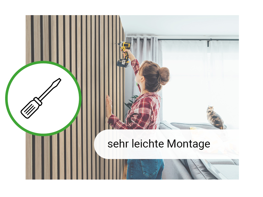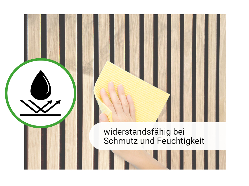 De panelen bestaan uit een 5 mm dikke dragerplaat van zwart vilt, waarop 6 mm dikke MDF-lamellen zijn bevestigd. Deze bijzondere structuur maakt een optimale akoestische regulering en nagalmvermindering mogelijk.