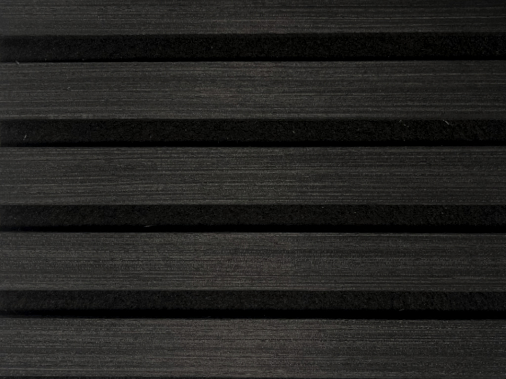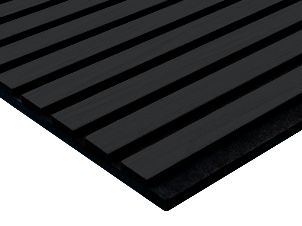De panelen bestaan uit een driezijdige gefineerde draagplaat van zwart vilt, waarop 9 mm dikke MDF-lamellen zijn aangebracht. Deze bijzondere structuur maakt een optimale akoestische regulering en nagalmreductie mogelijk.