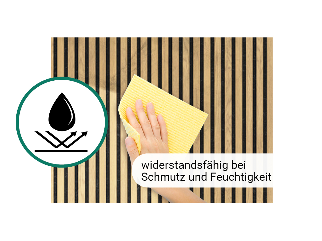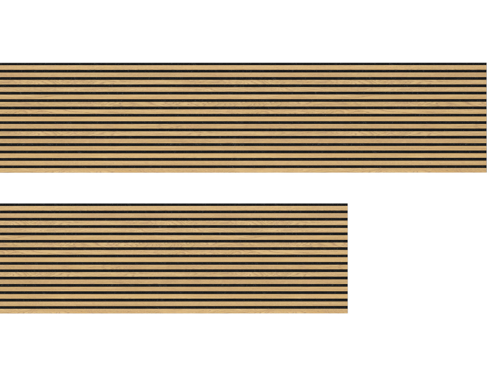 De akoestische panelen worden gebruikt voor de vormgeving van wanden en plafonds. Bovendien staan de akoestische eigenschappen van de producten op de voorgrond. De panelen hebben een zwarte draagplaat gemaakt van gerecycled, geluidsabsorberend polyester, waarop lamellen (MDF) zijn aangebracht, die met knoestvrij eiken zijn gefineerd – het hout voor lamellen en fineer komt uitsluitend uit verantwoord beheerde bosbouw .