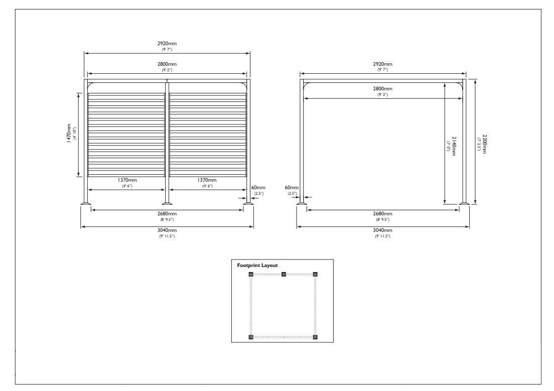 De 4‑hoekige pergola heeft een breedte van 292 cm, een diepte van 292 cm en een hoogte van 220 cm. Dankzij een nokhoogte van 220 cm kun je de ruimte optimaal benutten. Voor aangename schaduw zorgt het doekdak, een afneembare zonwering van polyester. Gebruik voor het maken van de fundering de plattegrond en de meegeleverde montagehandleiding als leidraad.