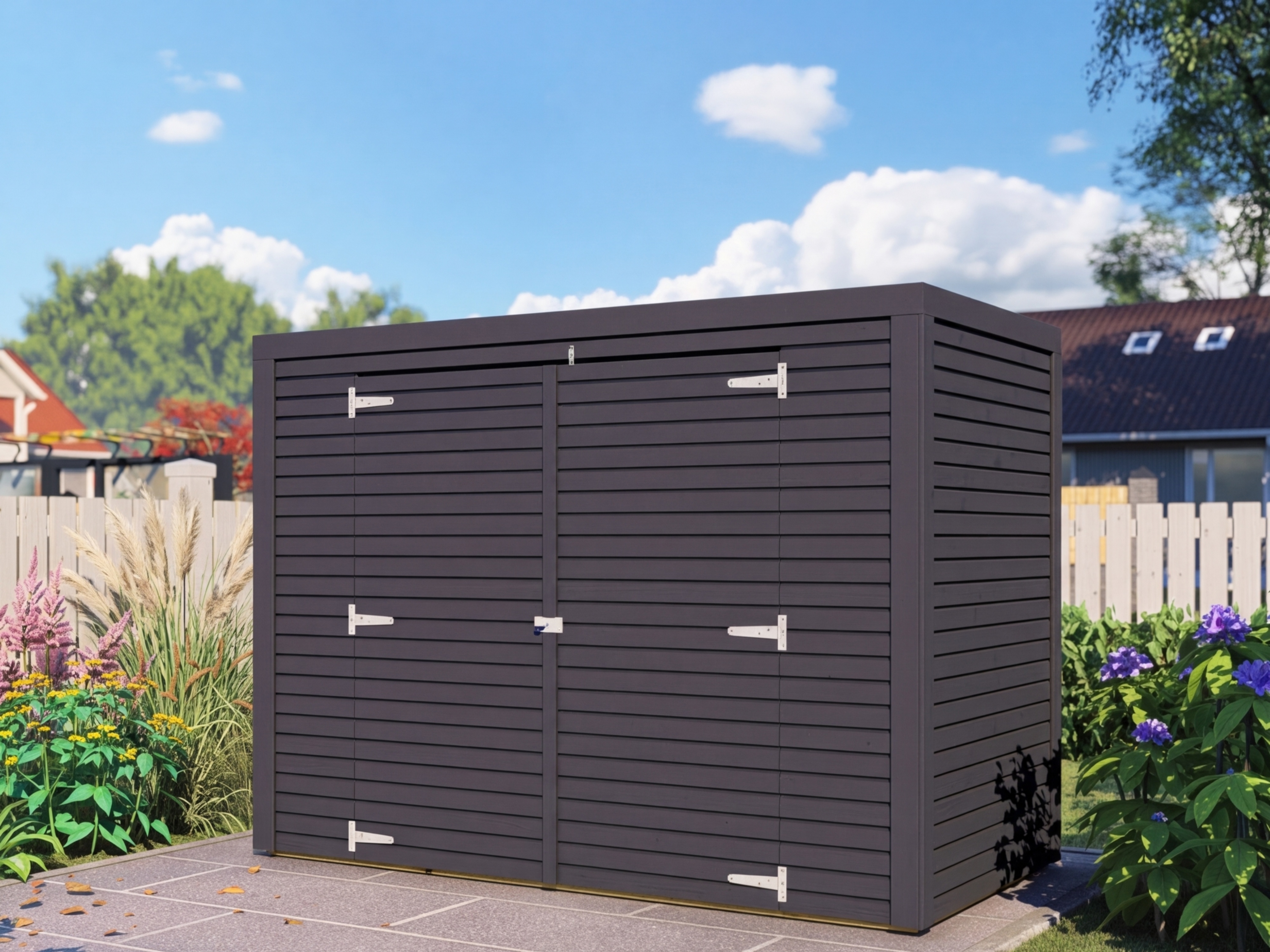 In deze Bikebox staat je fiets veilig en droog – beschermd tegen wind en weer en dankzij de veiligheidsoverval ook beter beveiligd tegen diefstal. Door de antracietkleurige lak/beits ziet deze box er bovendien strak en modern uit en wordt het een echte blikvanger in je tuin of op je oprit. De combinatie van houtlak en houtbeits zorgt voor een sterke bescherming tegen weersinvloeden, insecten en schimmel, waardoor de levensduur van het hout duidelijk wordt verlengd. Voor langdurig behoud van dit product adviseren we de beschermlaag regelmatig te vernieuwen.