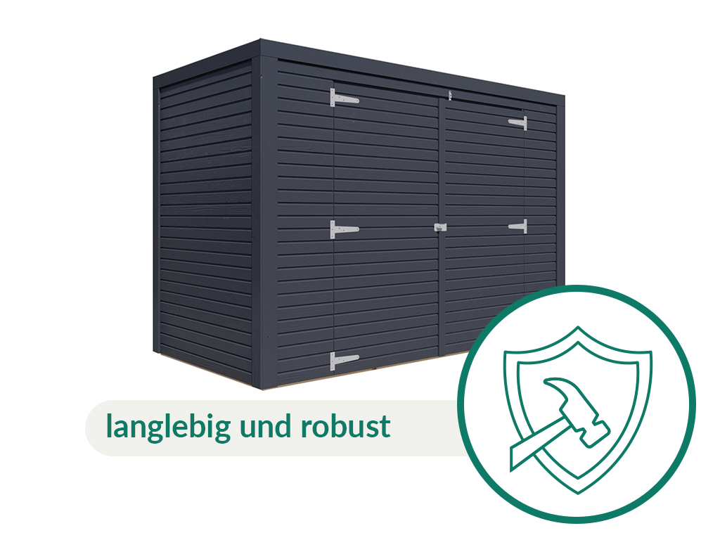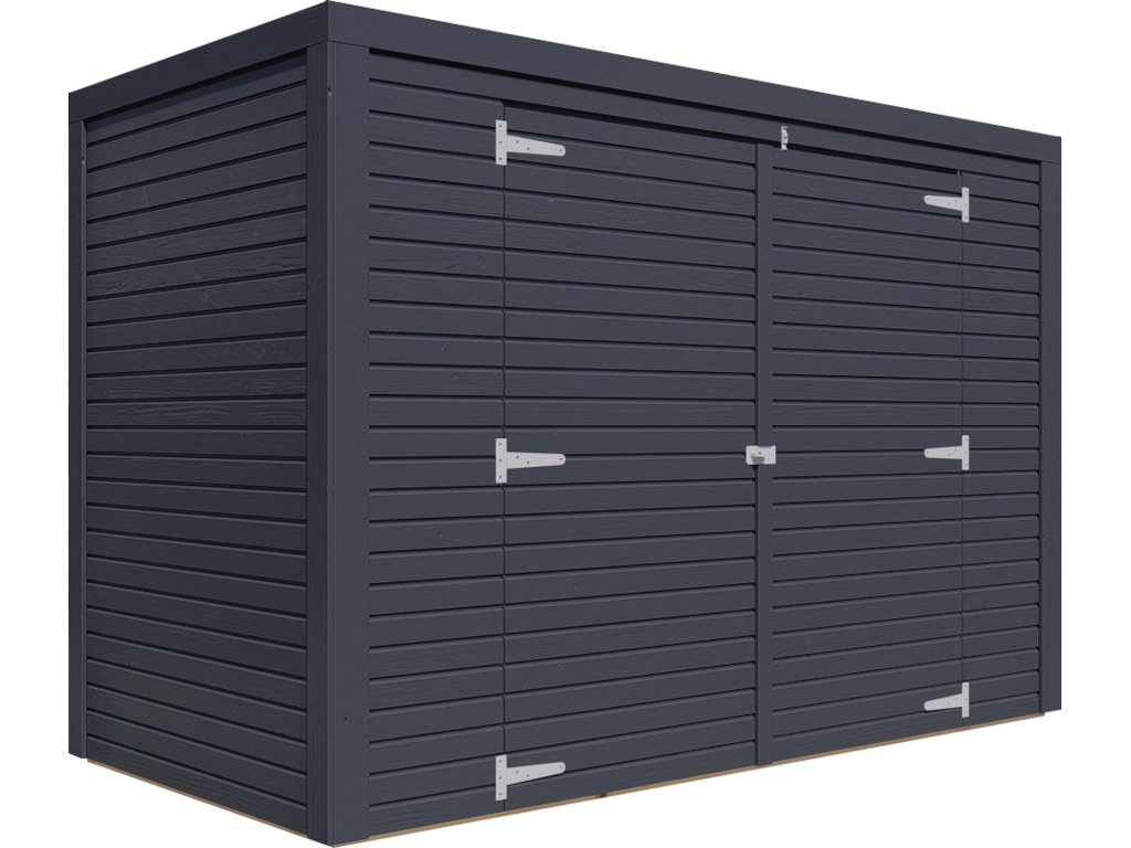 In deze Bikebox staat je fiets veilig en droog – beschermd tegen wind en weer en dankzij de veiligheidsoverval ook beter beveiligd tegen diefstal. Door de antracietkleurige lak/beits ziet deze box er bovendien strak en modern uit en wordt het een echte blikvanger in je tuin of op je oprit. De combinatie van houtlak en houtbeits zorgt voor een sterke bescherming tegen weersinvloeden, insecten en schimmel, waardoor de levensduur van het hout duidelijk wordt verlengd. Voor langdurig behoud van dit product adviseren we de beschermlaag regelmatig te vernieuwen.
