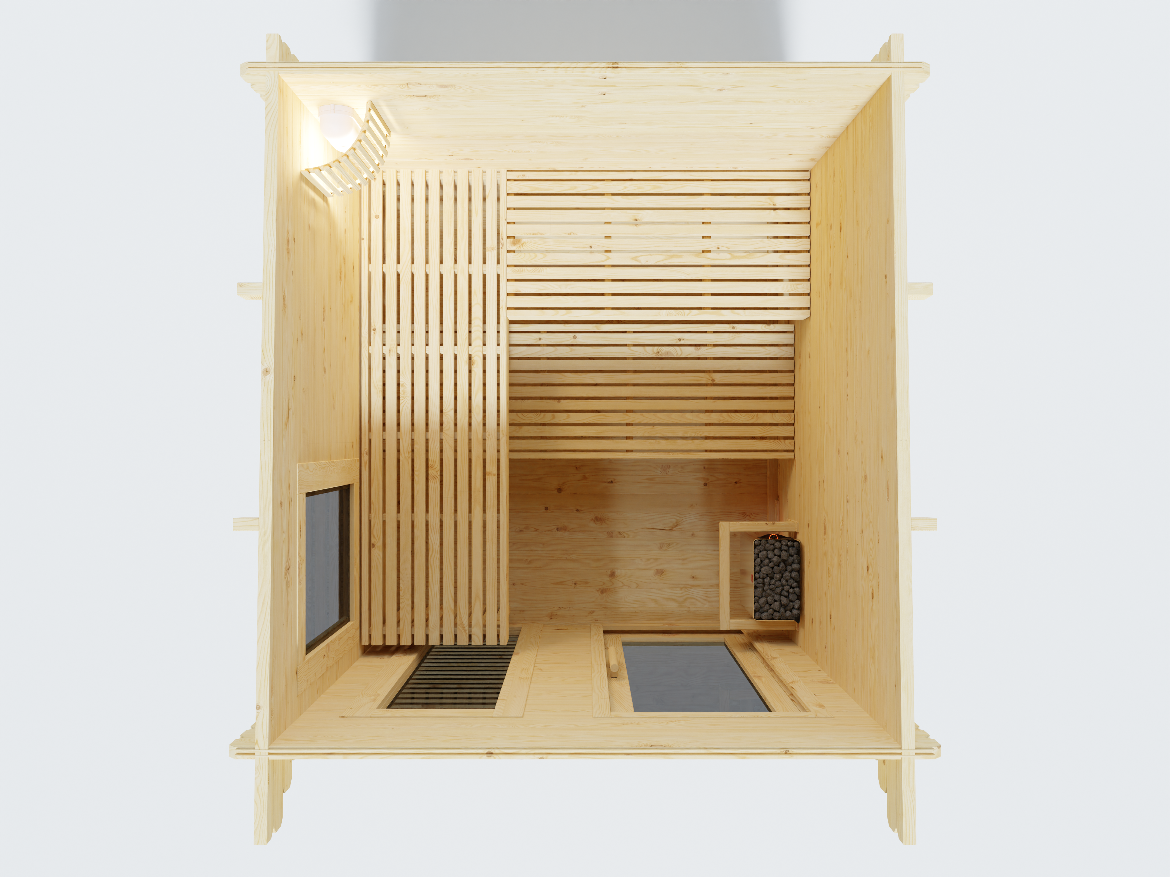 2 ligbanken, 2 hoofdsteunen, kachelbeschermingsrooster, 1 saunalamp, dakleer