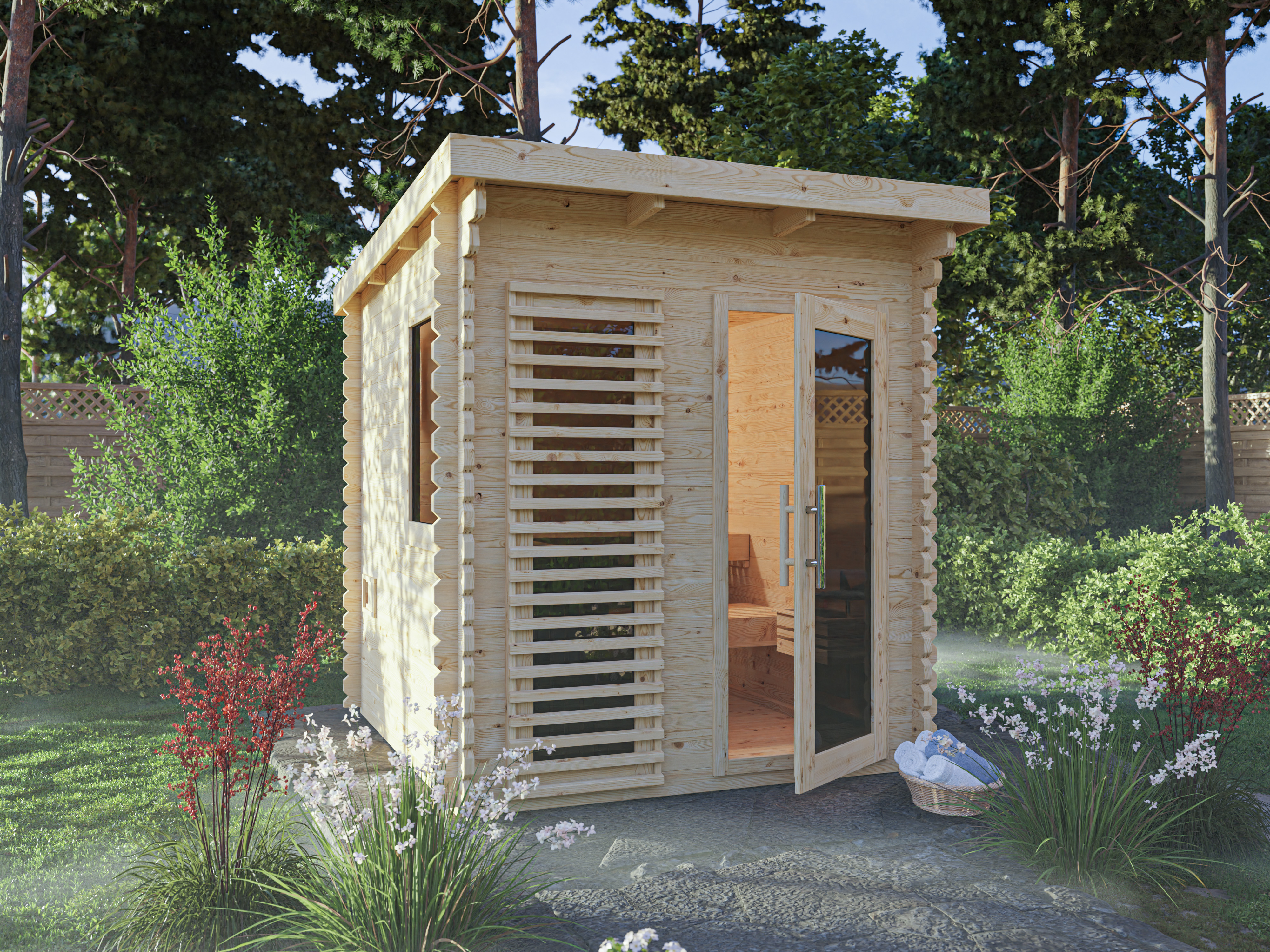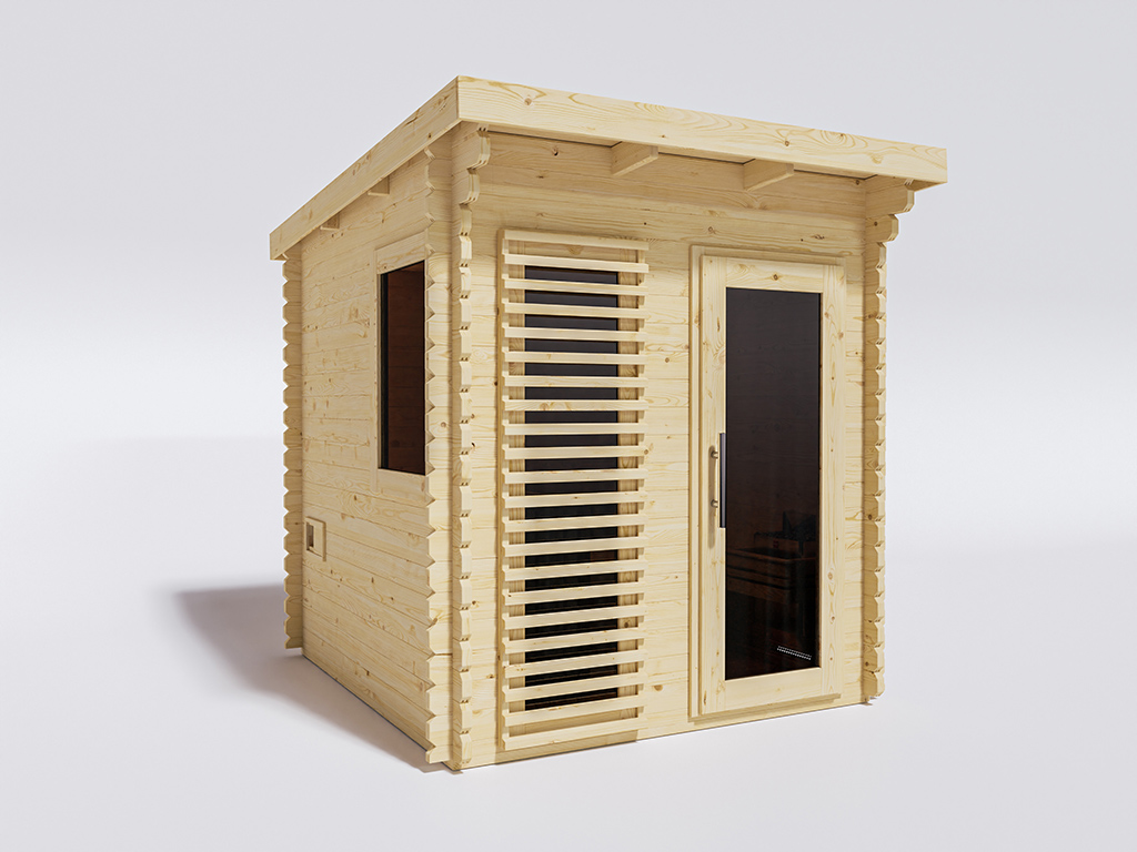 Deze buitensauna is voorzien van een stevige grafiet glazen deur met een houten frame van massief Scandinavisch vurenhout.