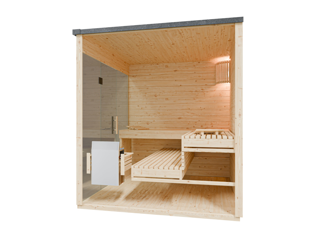 3 ligbanken, 2 hoofdsteunen, kachelbeschermrooster, 1 saunalamp, dakleer