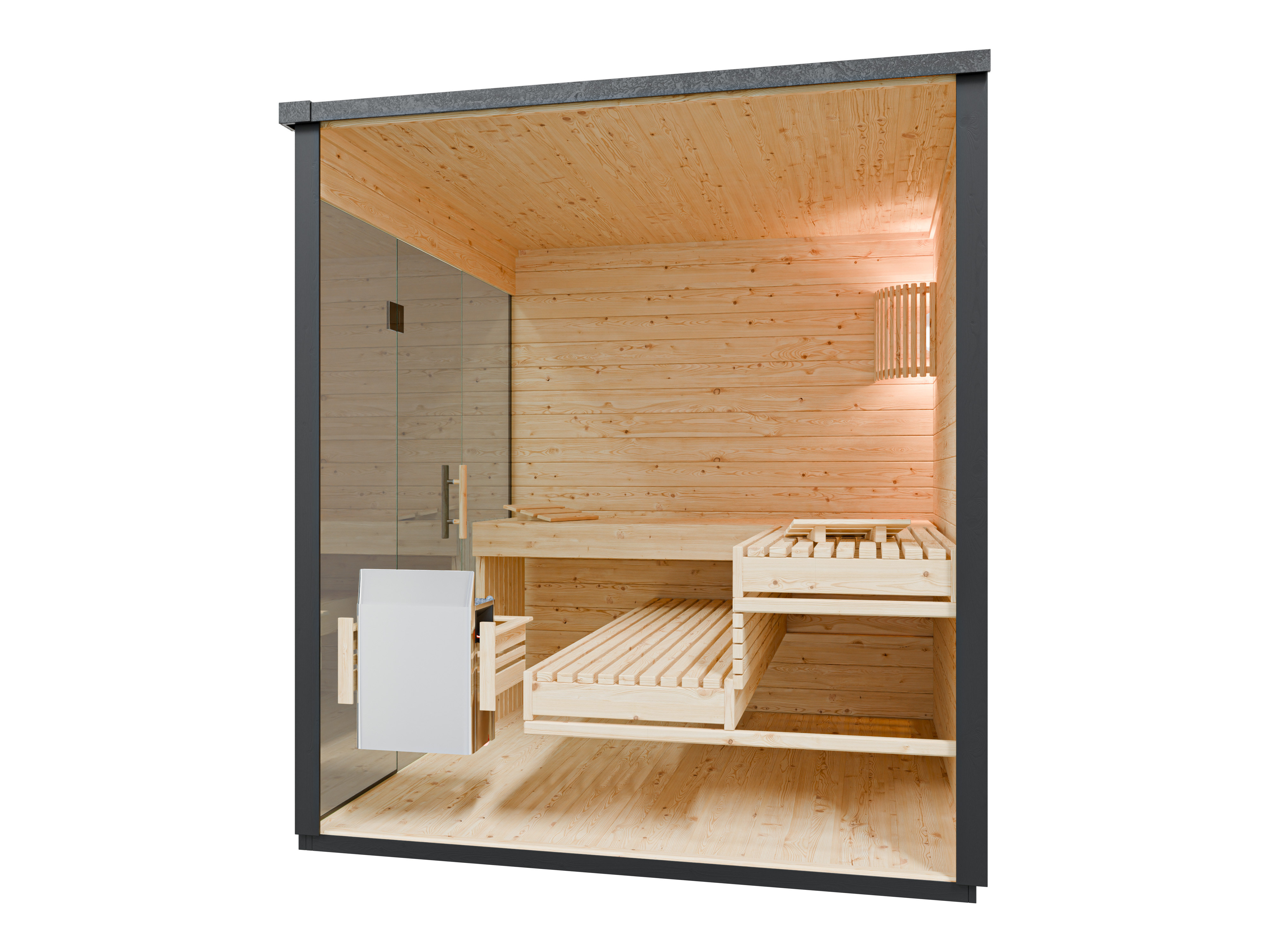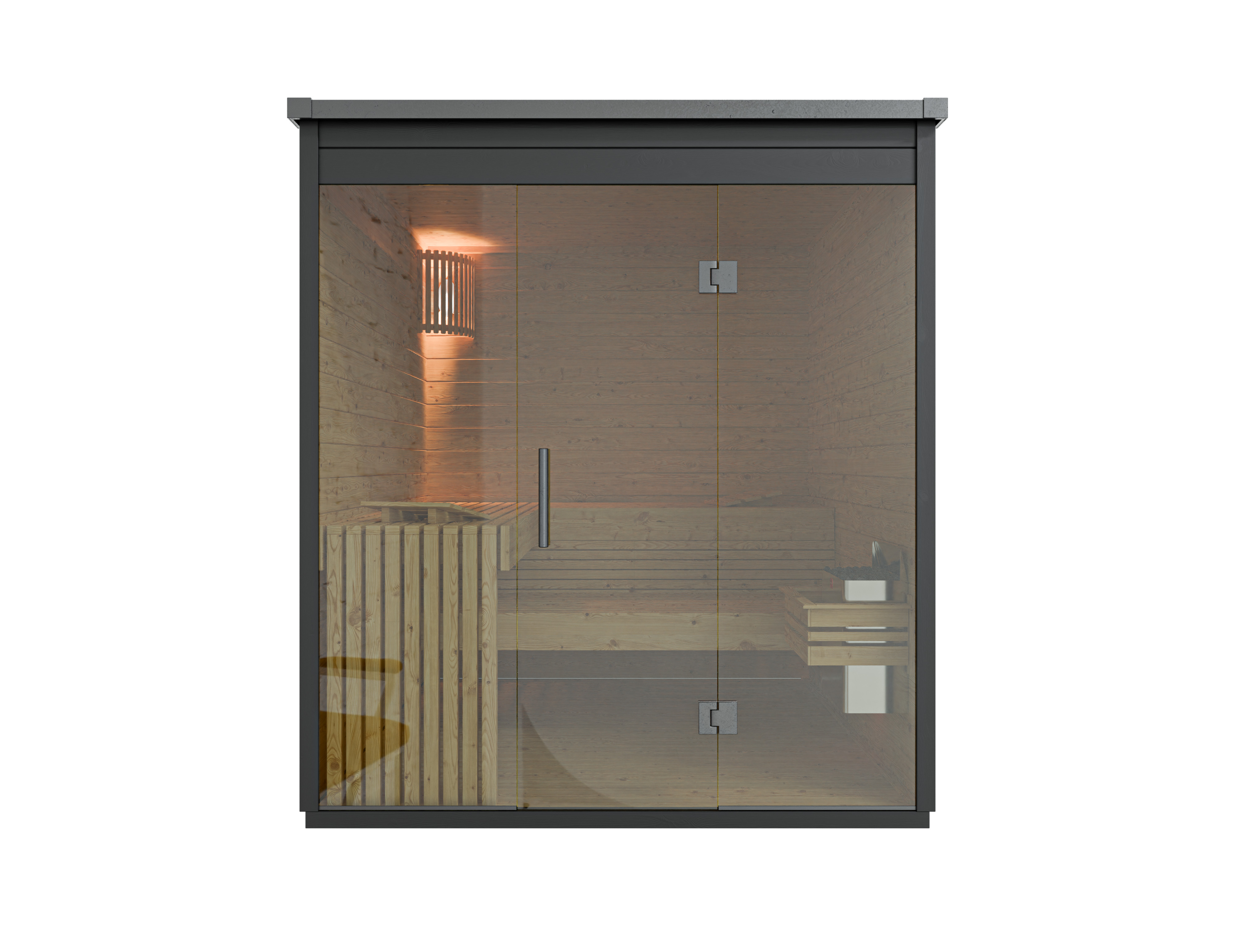 De sauna beschikt over een bronzen, heldere volledig glazen deur.
