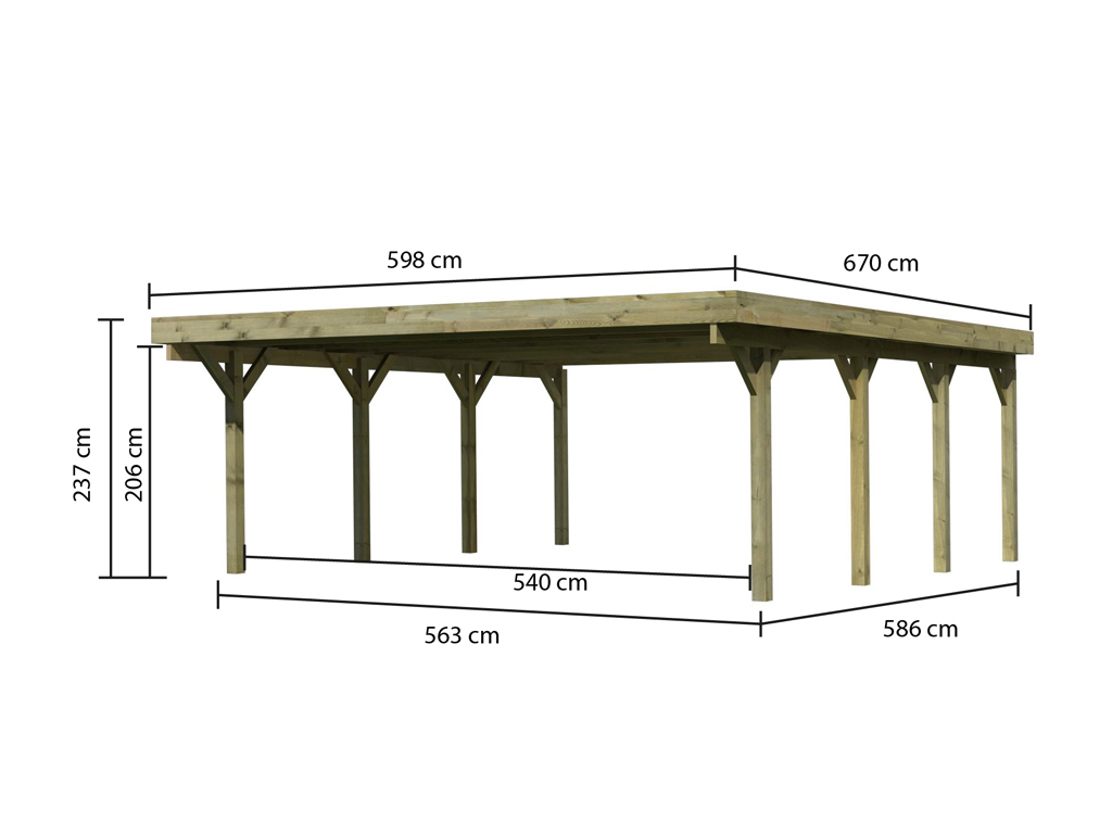 B x D x H: 598 x 670 x 237 cm, incl. stalen dak.