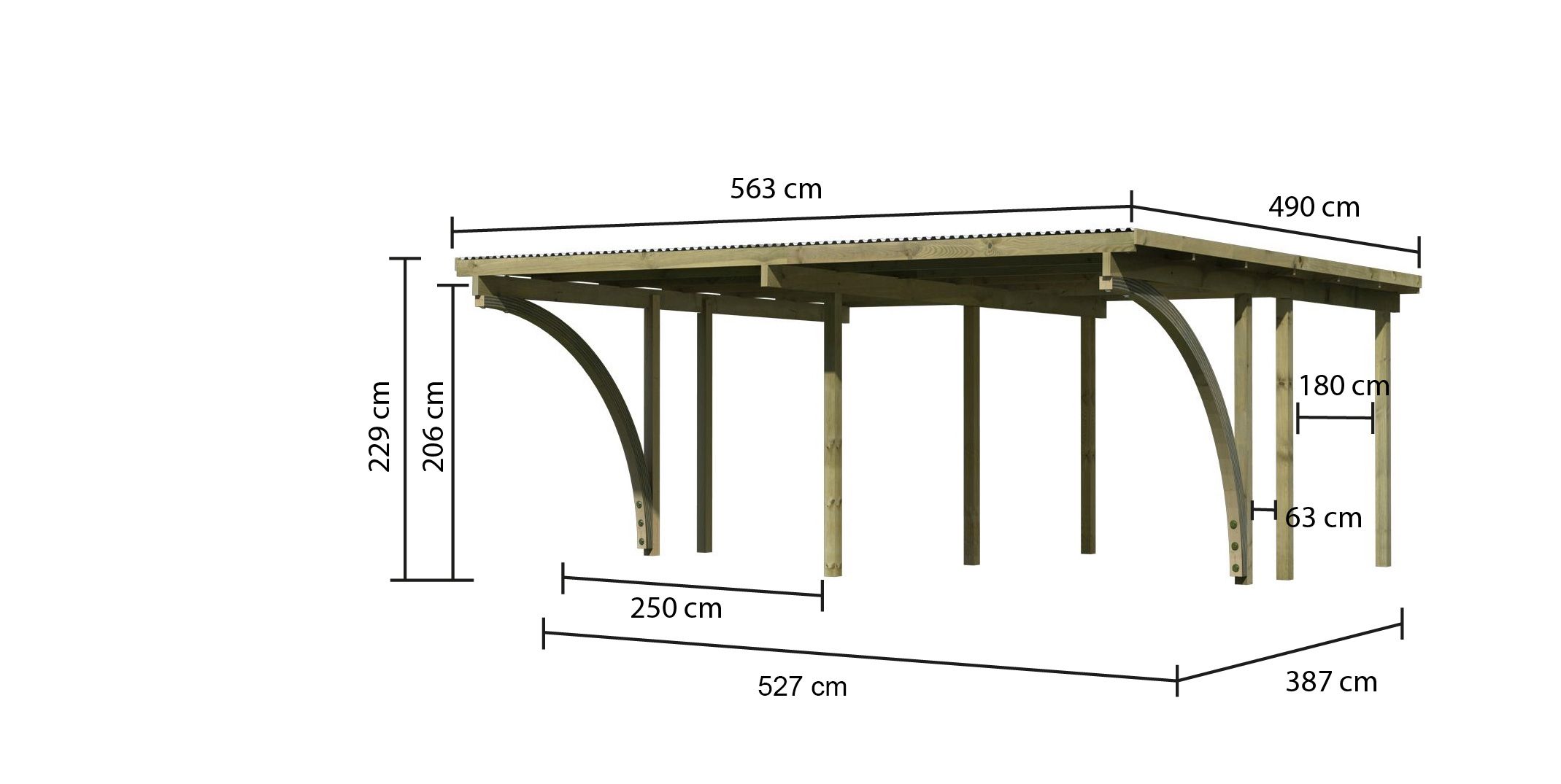 B x D x H: 563 x 490 x 229 cm, plat dak, massief hout kdi