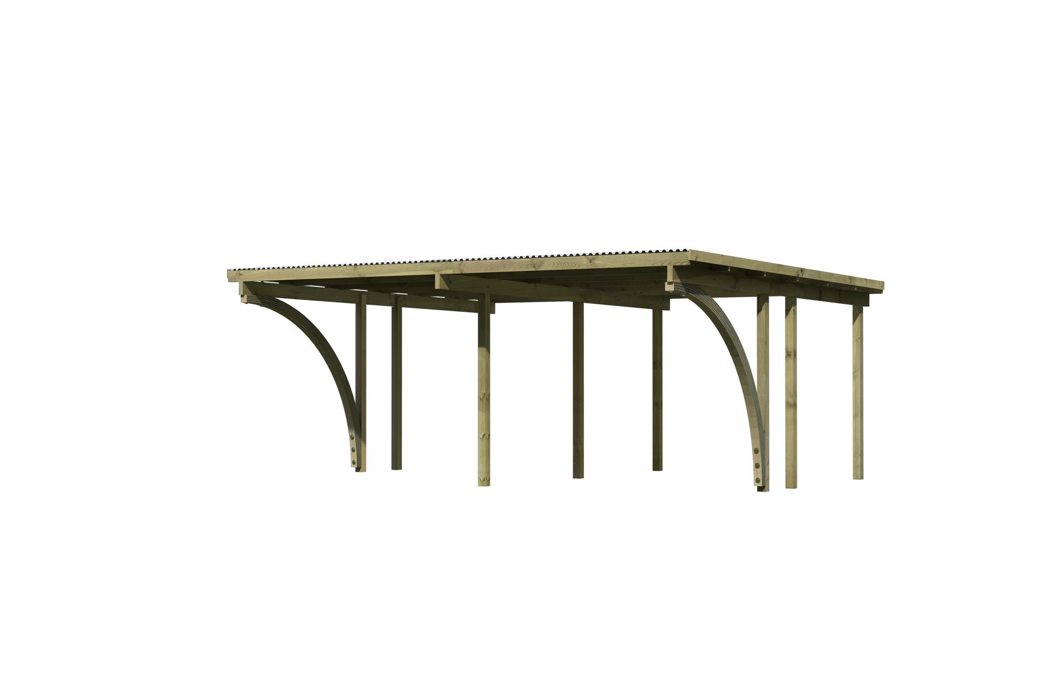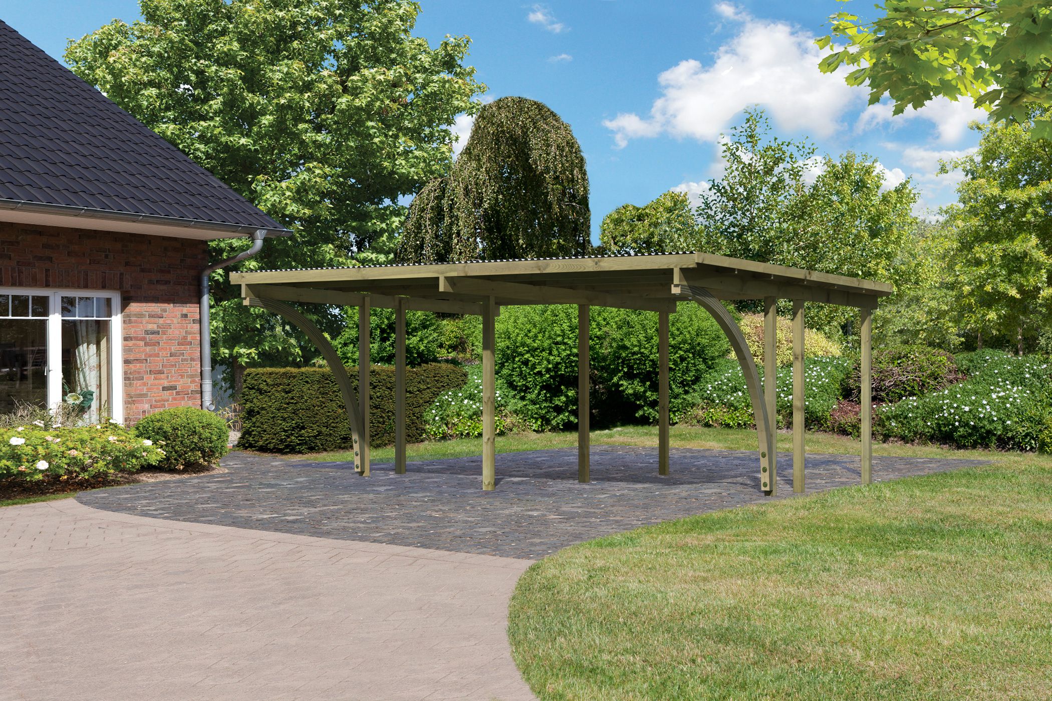 De 9 x 9 cm dikke palen van de carport zijn gemaakt van chroomvrij, geïmpregneerd massief hout en zijn daarom bijzonder weerbestendig. Dankzij het praktische systeemontwerp is een eenvoudige en snelle montage ook mogelijk. - Praktische ingangsbogen