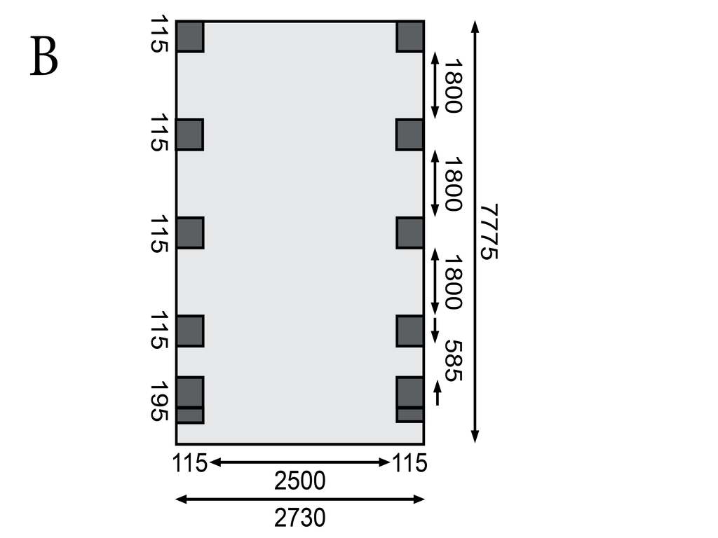 B x D x H: 318 x 670 x 234 cm, plat dak, massief hout kdi