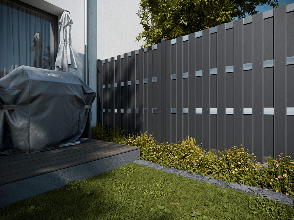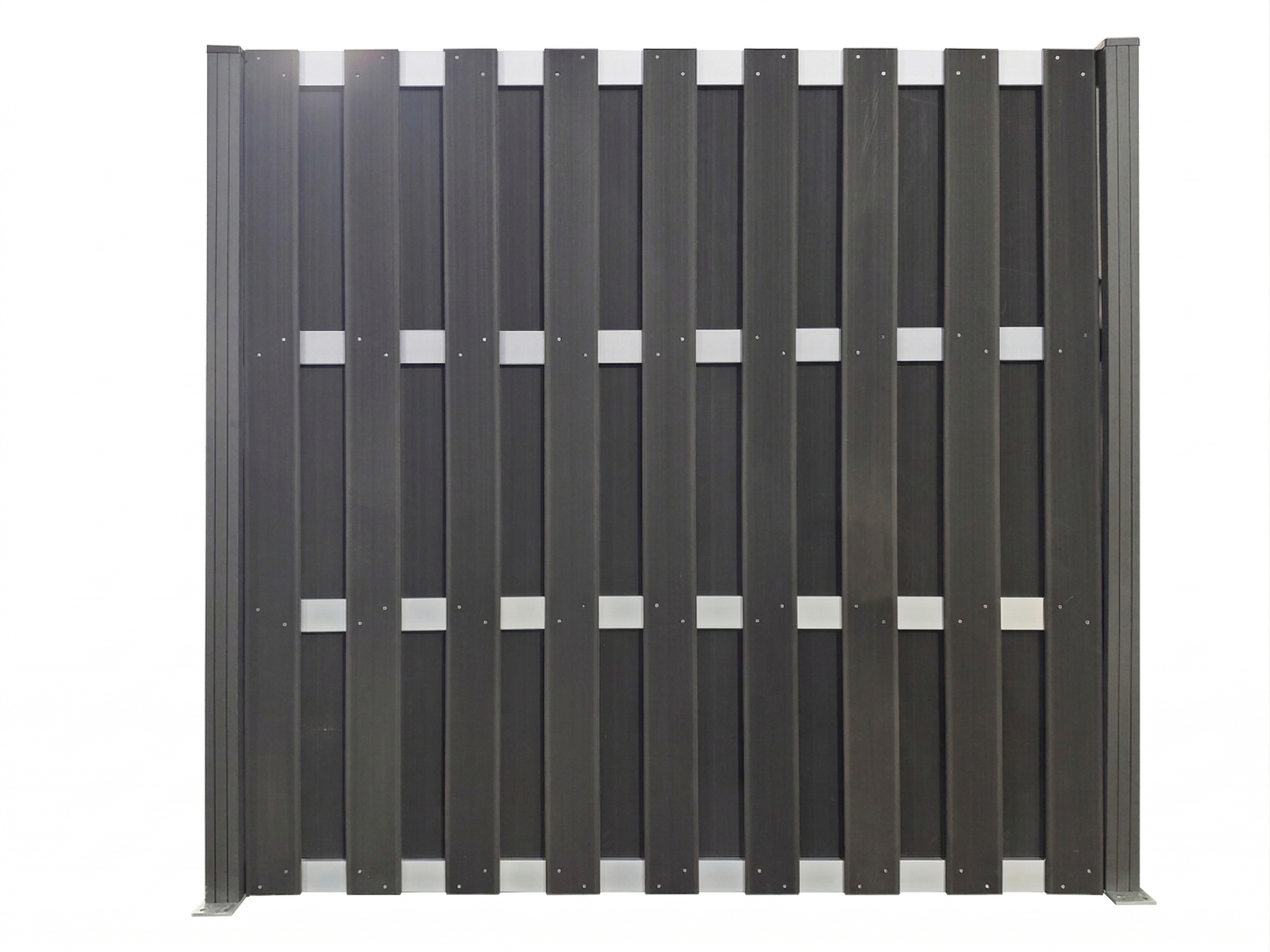 Dit composiet tuinscherm overtuigt door stabiliteit en lange levensduur in een modern design – een steekschutting die direct in het oog springt en een uitstekende prijs-kwaliteitverhouding biedt.