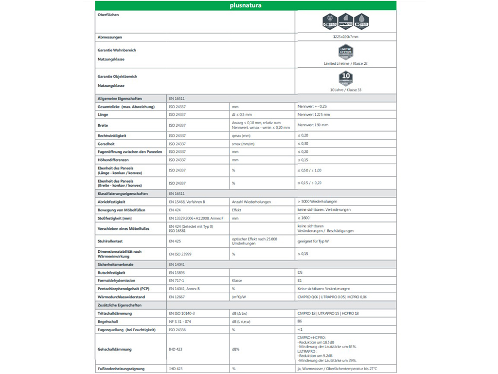 De stijve kern die in deze vloer wordt gebruikt, is een kurkdrager. Deze bestaat uit een mengsel van natuurlijke stoffen, zoals steenzaagsel. Bijzonder is dat er geen PVC-hulpstoffen in zitten, zoals bij veel andere rigid dragers het geval is. De functionele eigenschappen doen op geen enkele manier onder voor die van vergelijkbare rigid draagplaten. Plusnatura-producten zijn 100% ecologisch en zijn bekroond met de "Blauwer Engel".