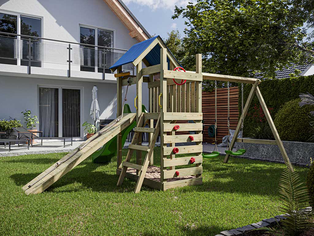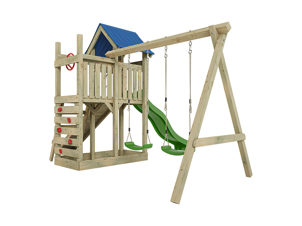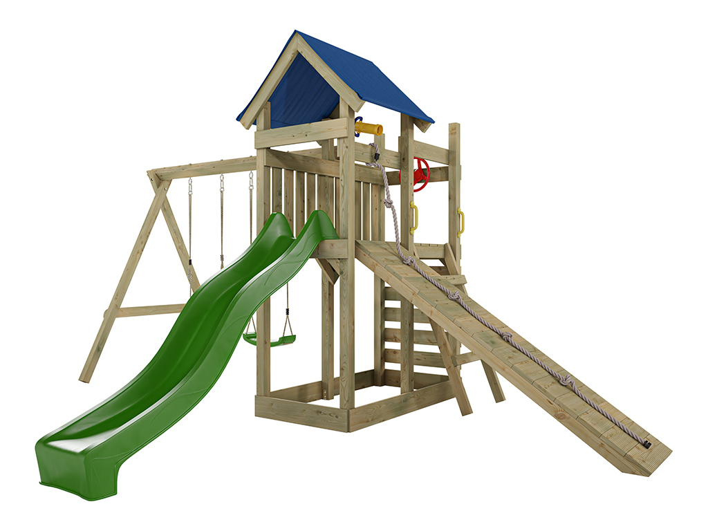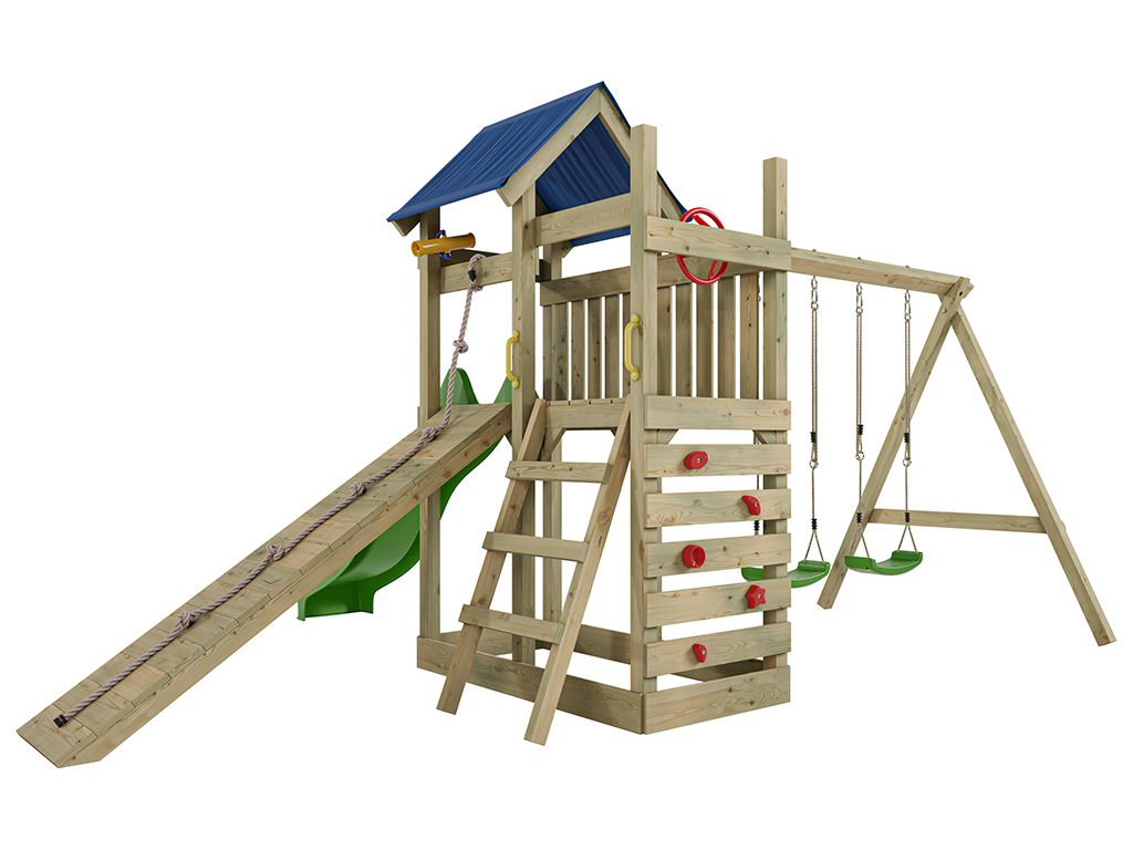 • Inclusief groene glijbaan en een 9 x 9 cm dikke schommelbalk.