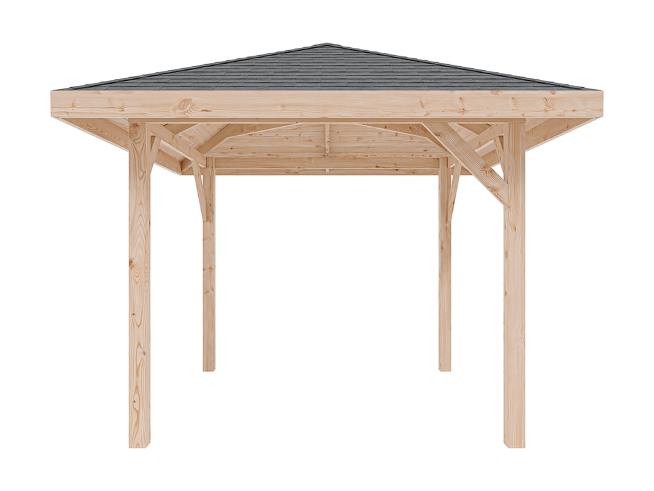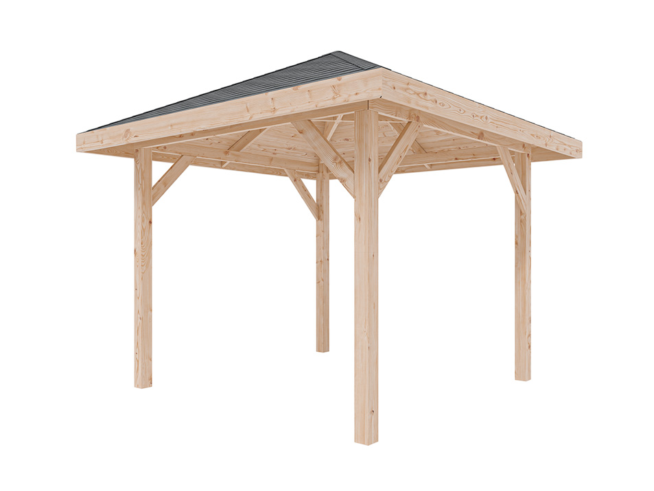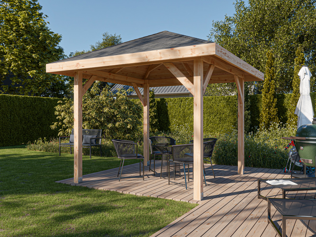 Het onbehandelde hout geeft de paviljoen een natuurlijke en tijdloze look. Let erop dat het hout uiterlijk direct na de montage met een geschikt houtbeschermingsmiddel moet worden behandeld. Laat je bij de keuze van houtbescherming adviseren door de vakhandel of volg de aanbevelingen van de fabrikant in de bijgevoegde montagehandleiding. Na de eerste behandeling moet de bescherming minimaal om de twee jaar worden herhaald om het hout blijvend te beschermen tegen vervorming, verwering en aantasting door insecten en schimmels. Een in de loop der tijd ontstaan zilvergrijs patina is een natuurlijke eigenschap van hout en geen gebrek.