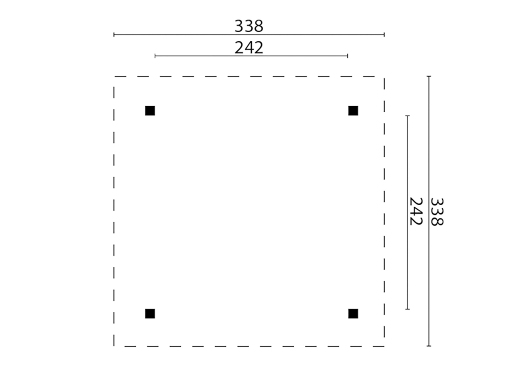 B x D x H: 338 x 338 x 306 cm, sokkelmaat B x D: 265 x 265 cm, paaldikte 11,5 x 11,5 cm