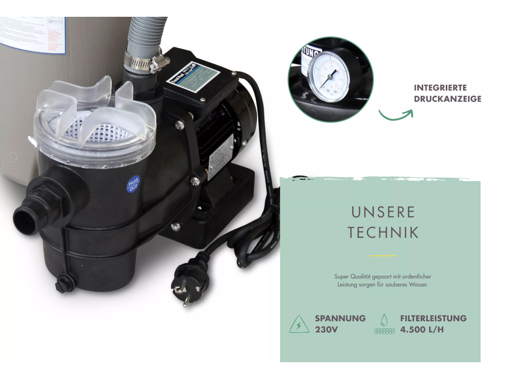 De levering omvat: houten opzetzwembad Modell 2, incl. zwembadtrap, zwembadfolie, beschermvlies en filterinstallatie.
