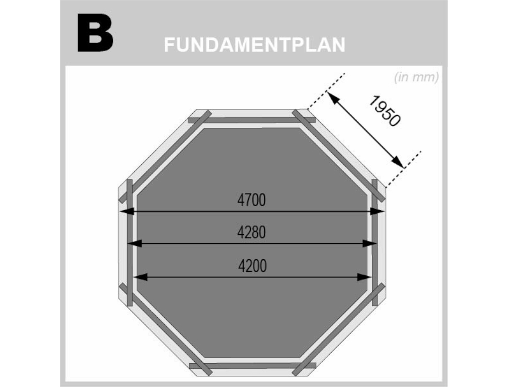 B x D x H: 470 x 470 x 124 cm, hoekverbinding met blokprofielen, incl. zwembadfolie, beschermvlies en filterinstallatie
