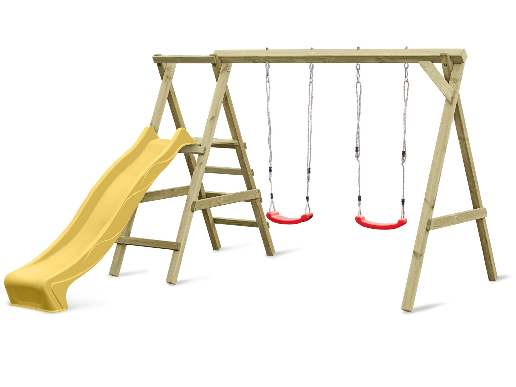 | Leveringsomvang: | Dubbele schommel met platform, 4 schommelhaken, 1 glijbaan, 2 schommelzitjes |