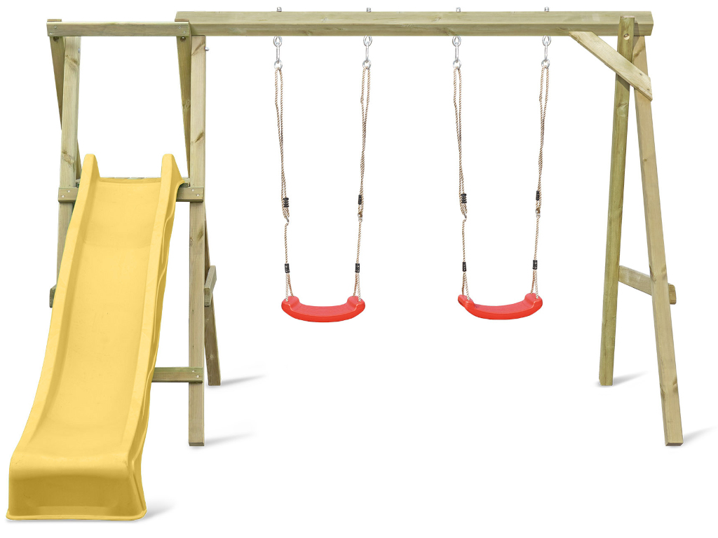 | Leveringsomvang: | Dubbele schommel met platform, 4 schommelhaken, 1 glijbaan, 2 schommelzitjes |