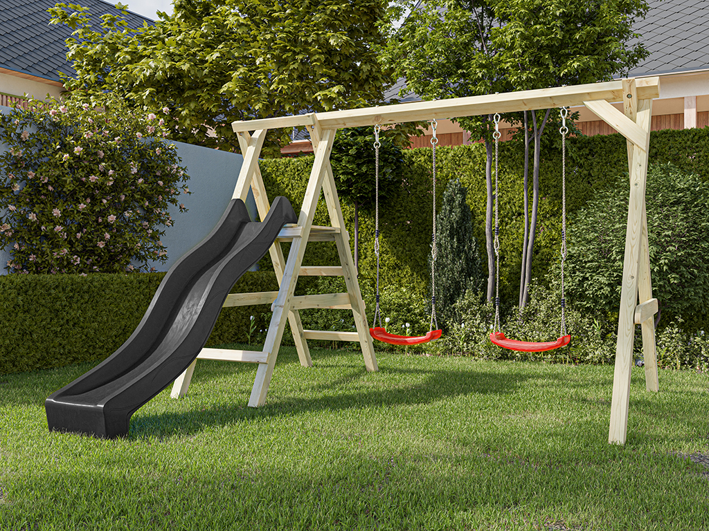| Leveringsomvang: | Dubbele schommel met platform, 4 schommelhaken, 1 glijbaan, 2 schommelzitjes |