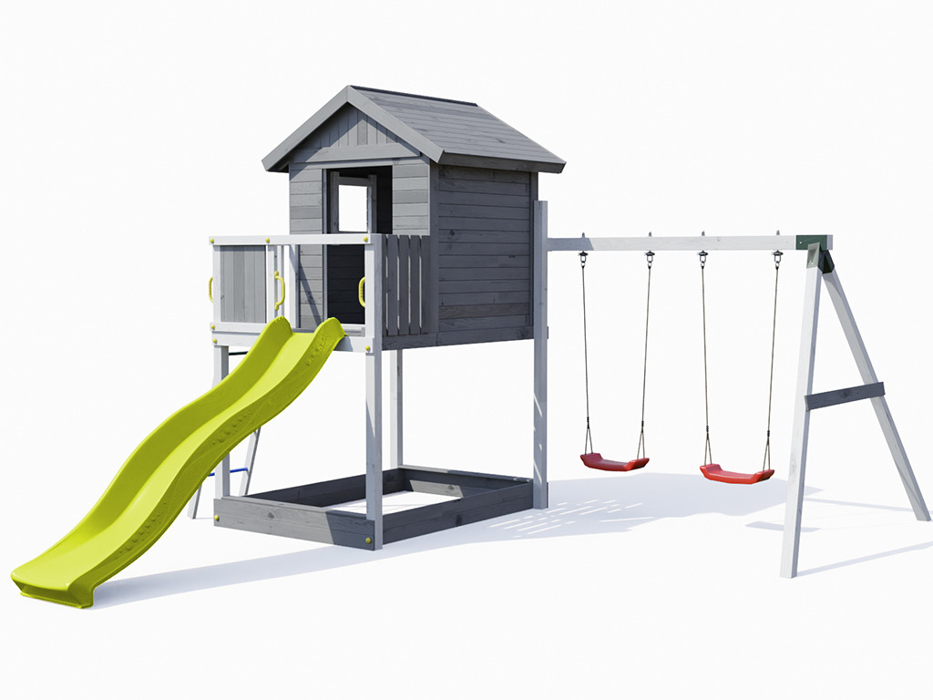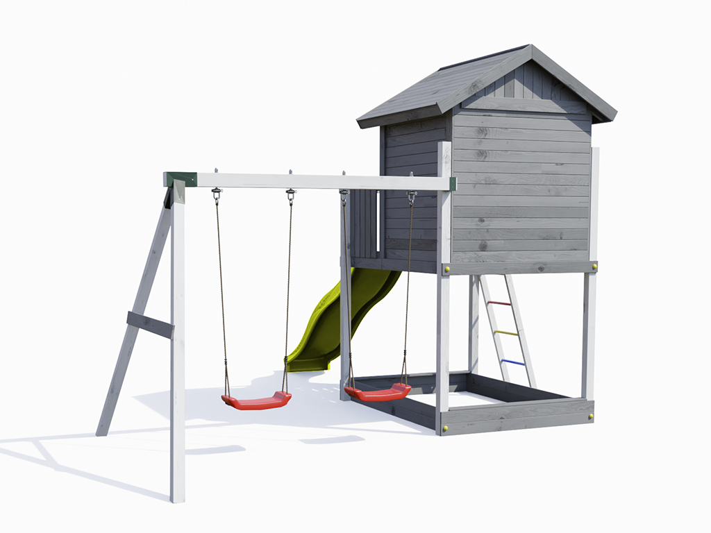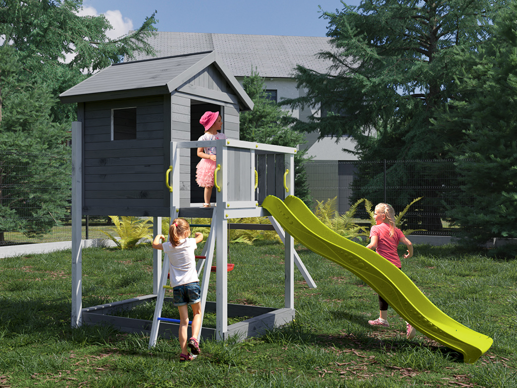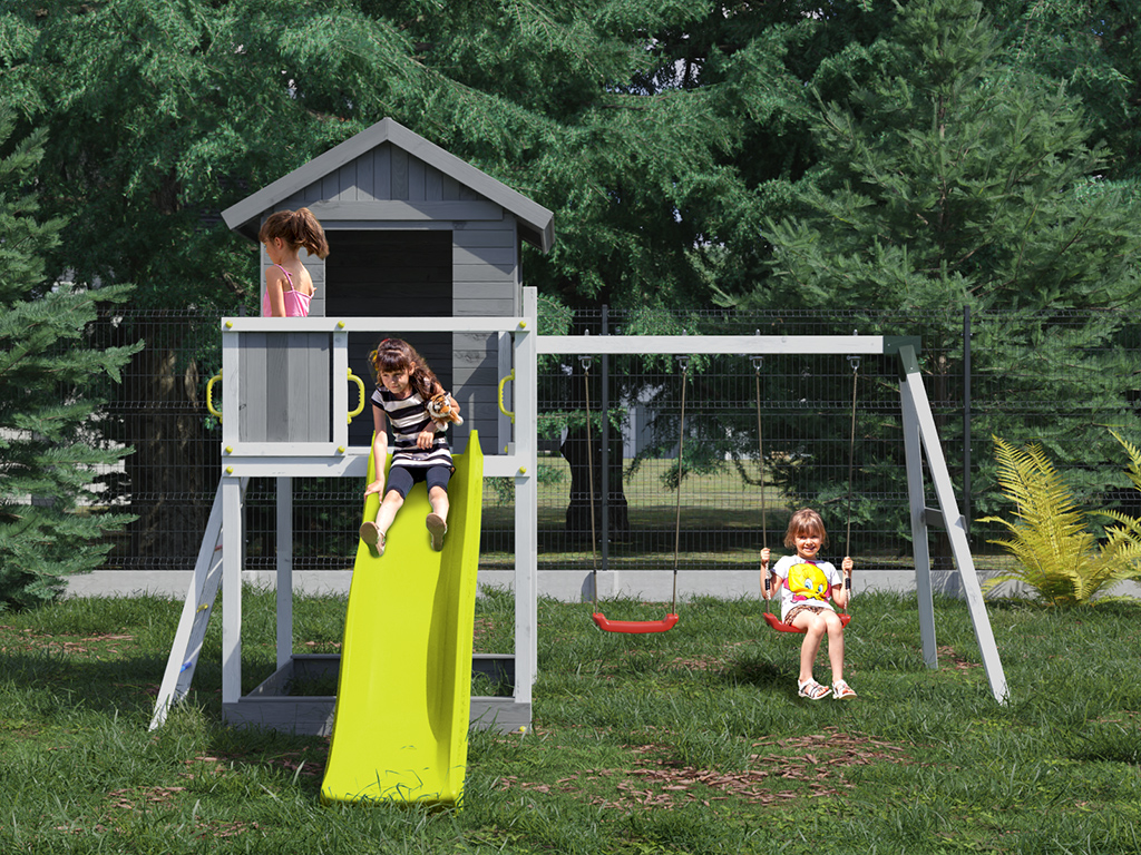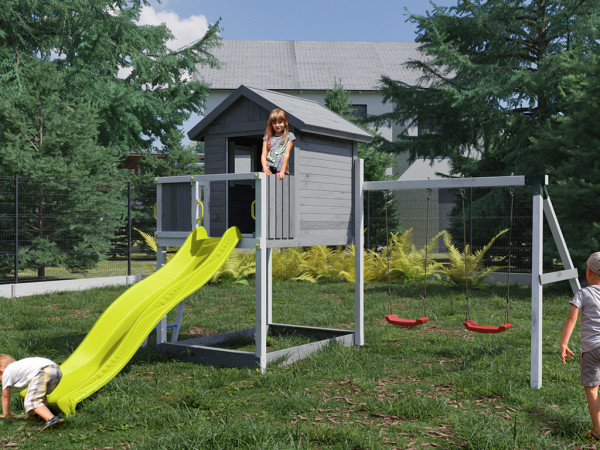 Speeltoren speelhuisje op palen "Galaxy S" incl. dubbele schommel grijs-wit en gele glijbaan