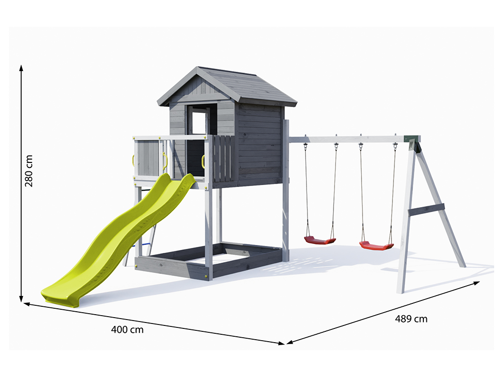 Afmetingen (B x D x H): 400 x 489 x 280 cm, incl. dubbele schommel en glijbaan, incl. platform en ladder