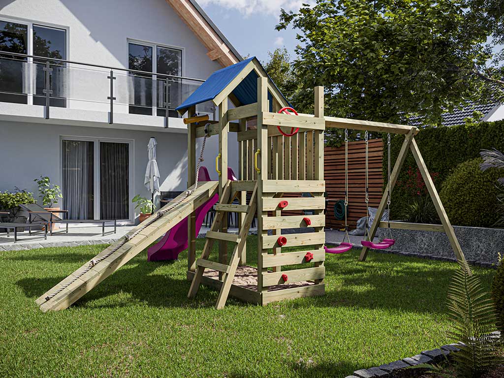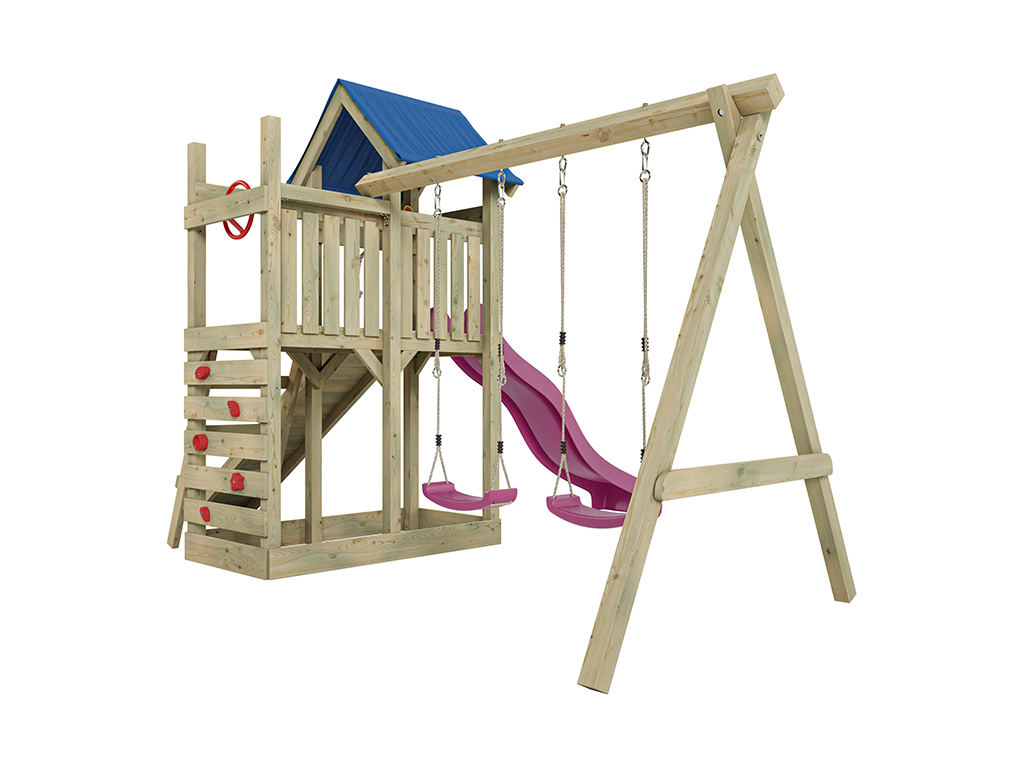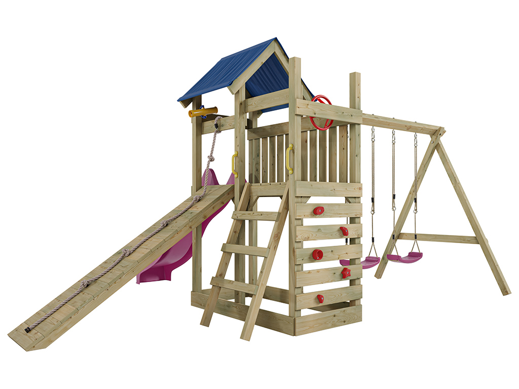 - Incl. glijbaan in roze met een 9 x 9 cm sterke schommelbalk.