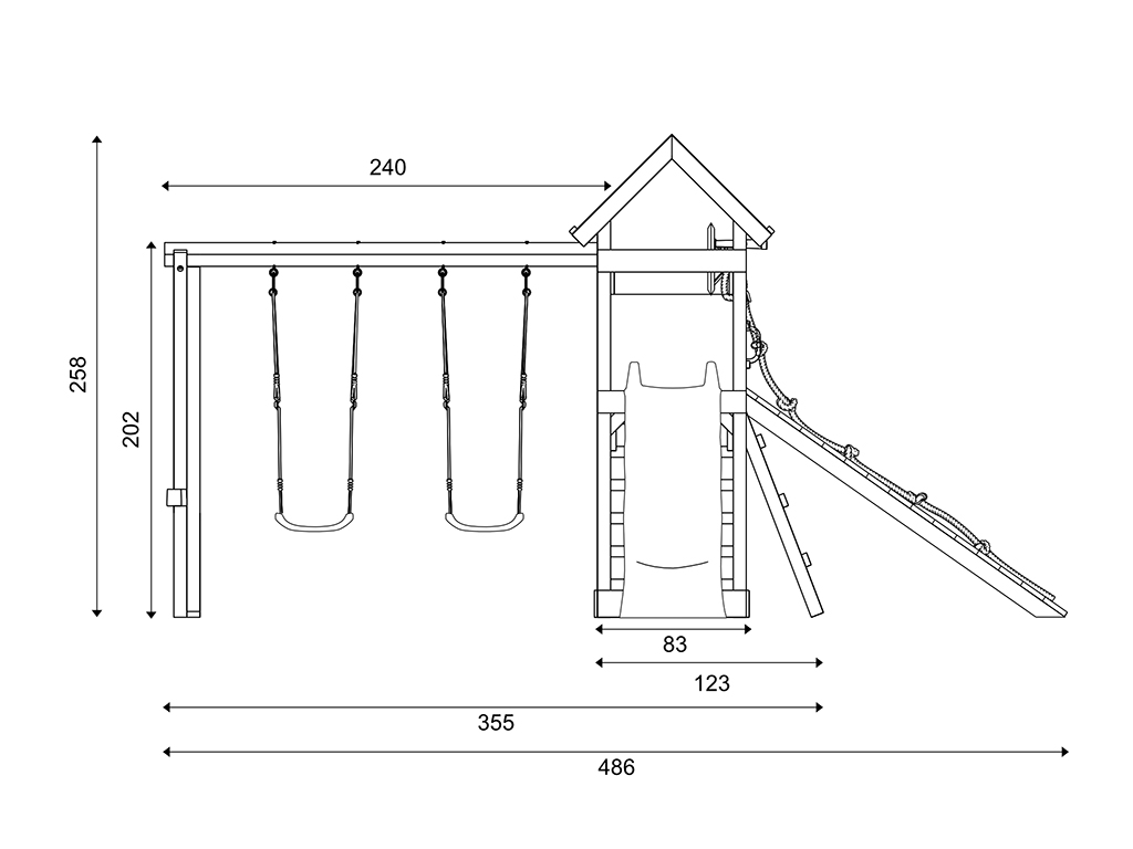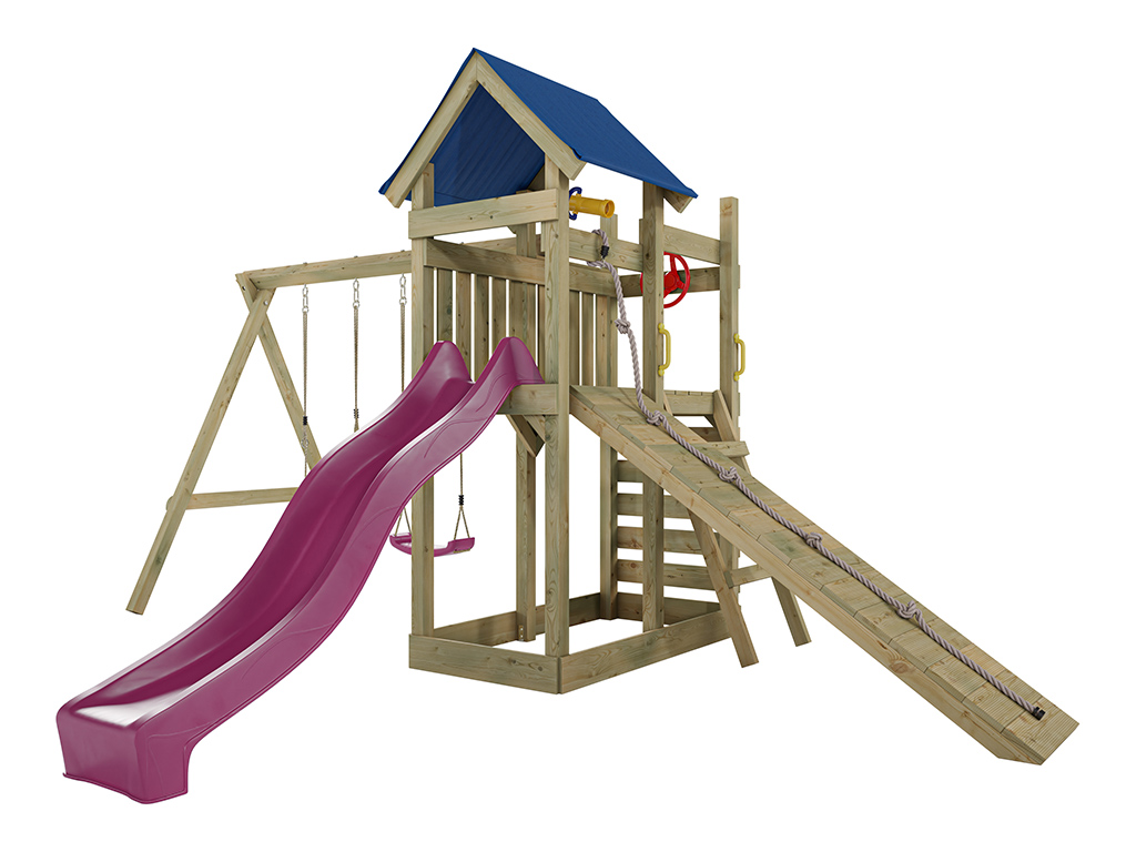 Deze speeltoren als buitenspeelgoed biedt je kind volop beweging en avontuur – een echte droom van een speeltoestel met glijbaan en schommel voor in de tuin. De buitenafmetingen van deze speeltoren zijn 481 x 486 cm. De nokhoogte is 258 cm.