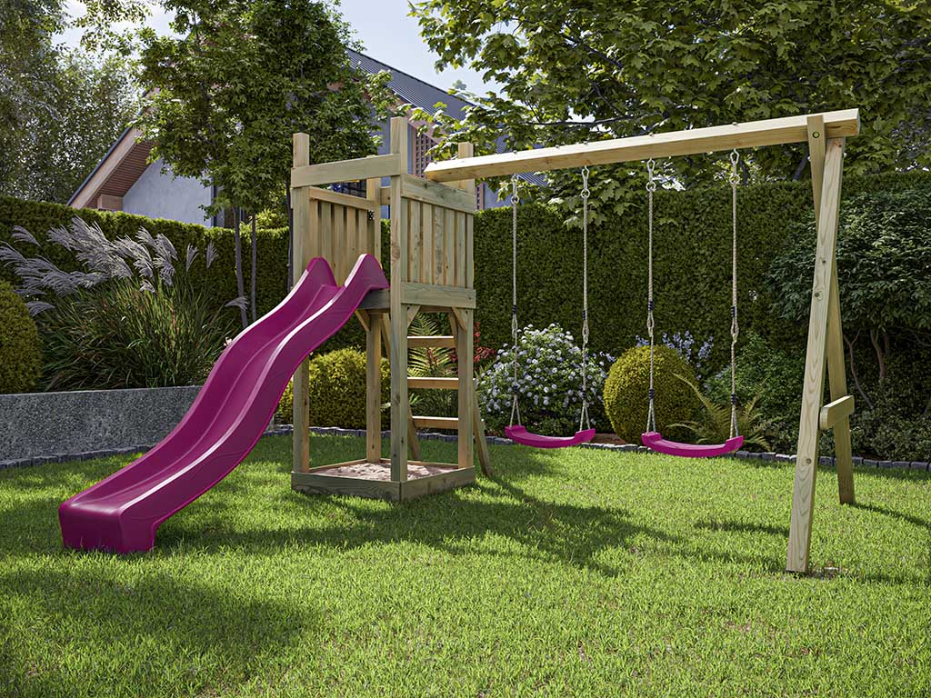 Geïmpregneerd houten speeltoren Skinny incl. dubbele schommel incl. glijbaan pink +...meer