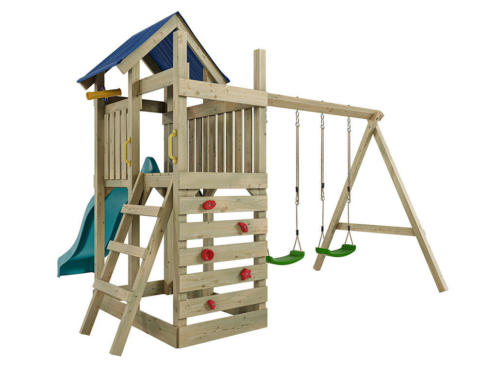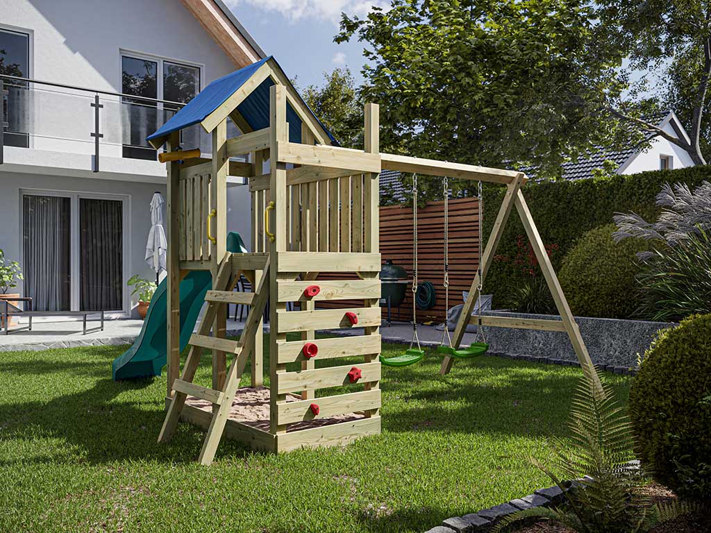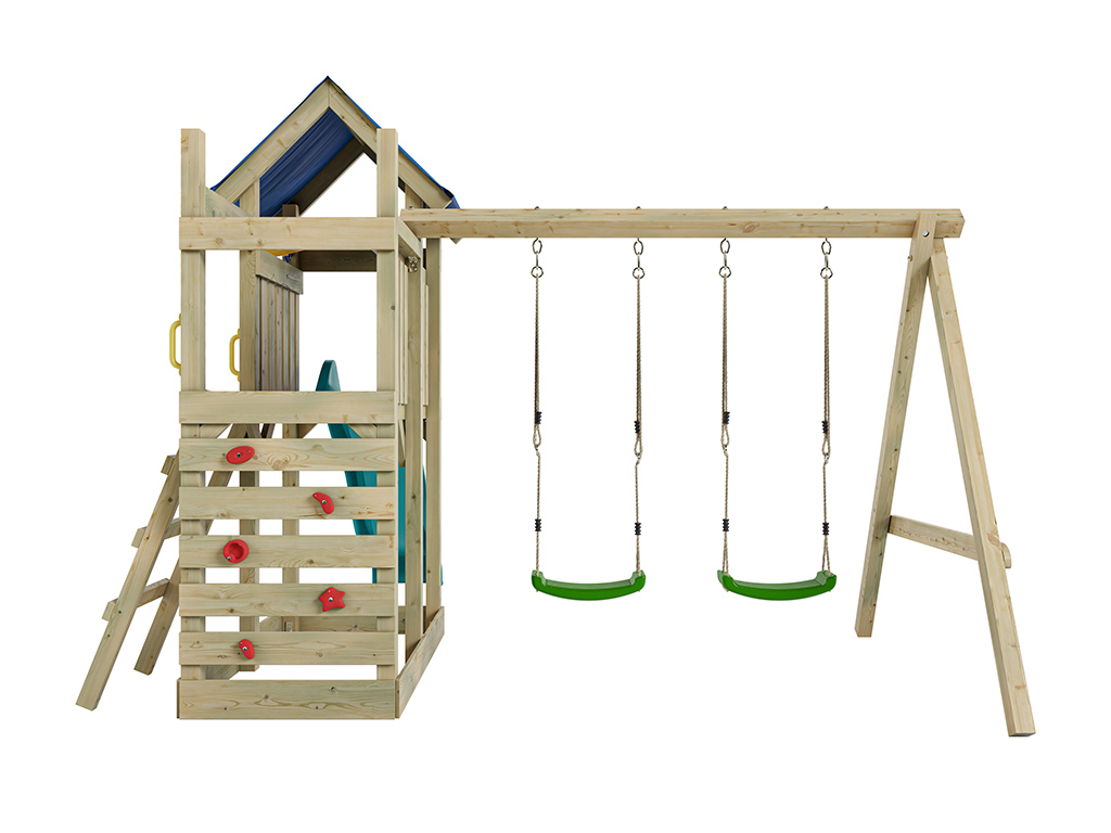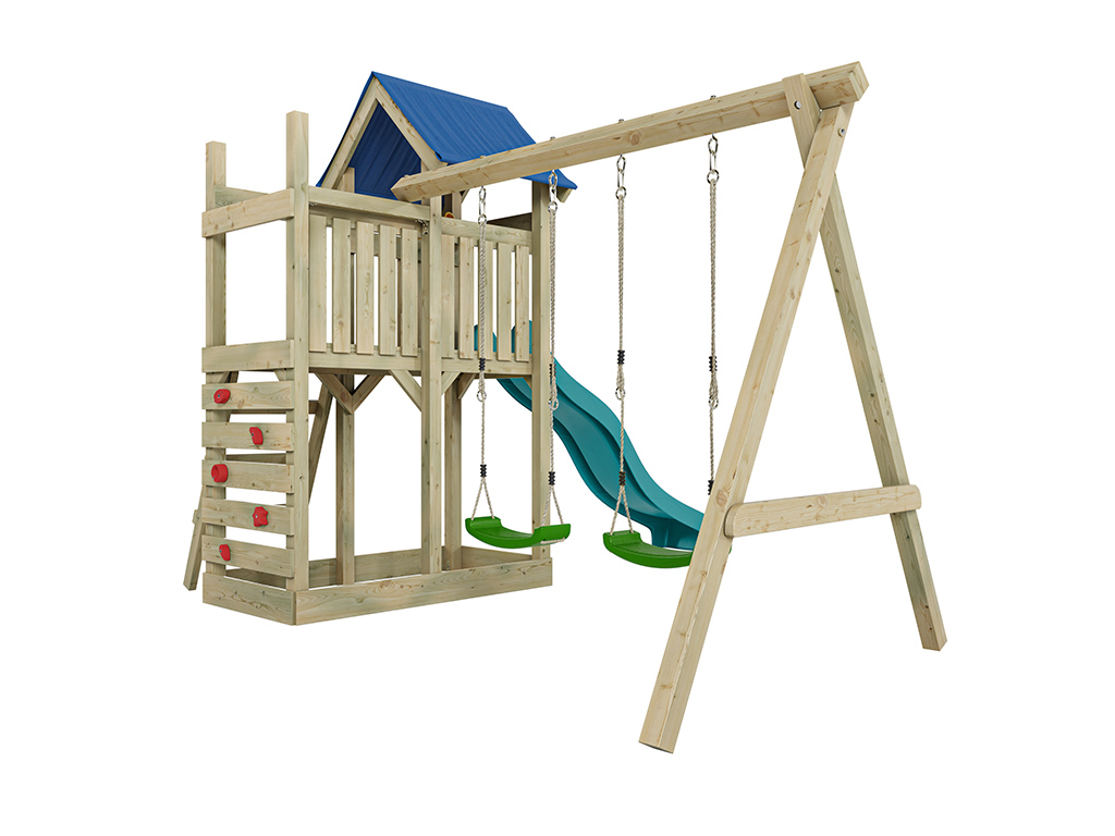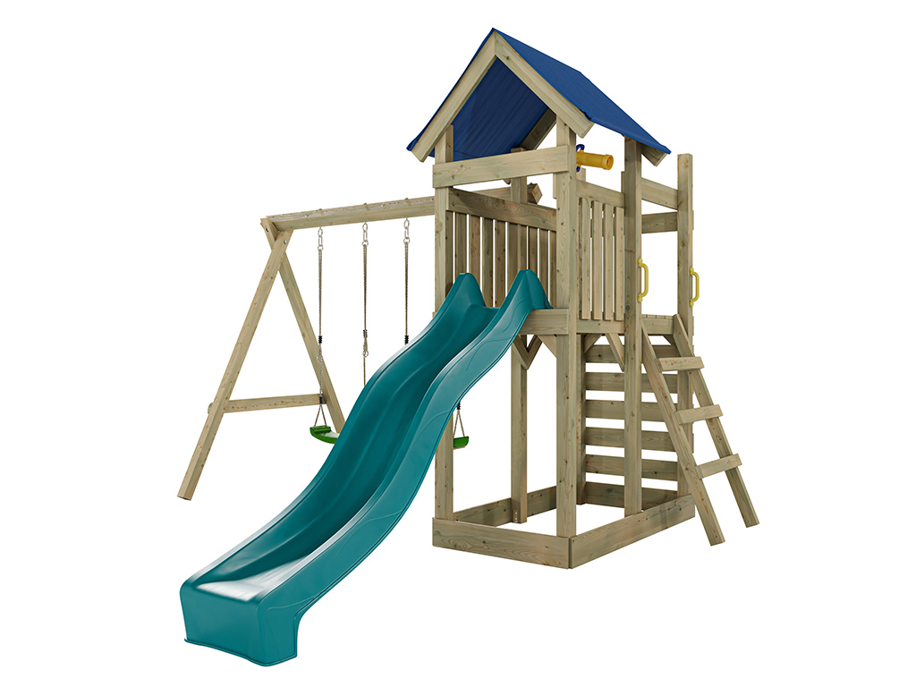 Geïmpregneerd houten speeltoren "Speedy" met dubbele schommel en turquoise glijbaan, groene schommel