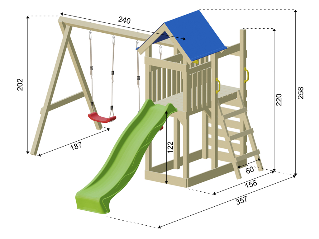 B x D x H: 355 x 386 x 258 cm, incl. klimwand, incl. turquoise glijbaan + groene zitjes