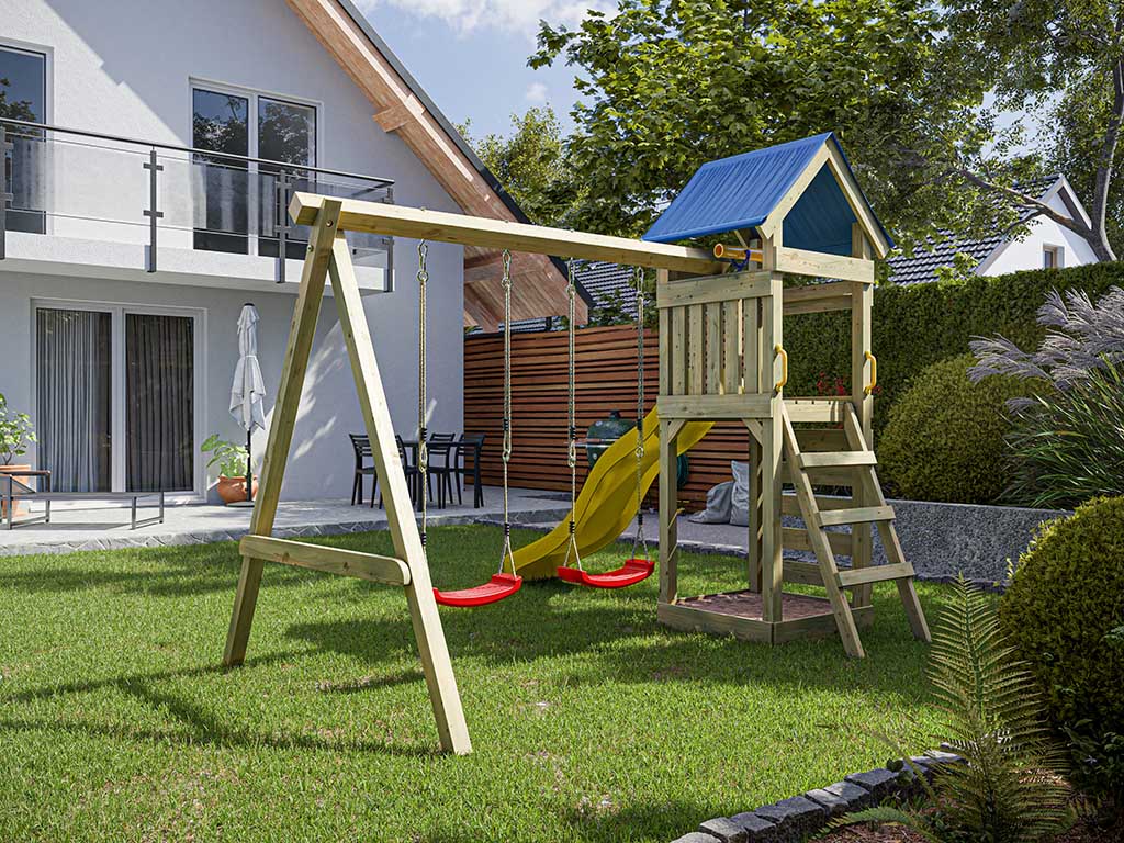 | Leveringsomvang: | Eenvoudige KDI speeltoren, dak van zeildoek, dubbele schommel, 2x schommelzitje of 1x nestschommel (afhankelijk van keuze), 4 schommelhaken, 2 handgrepen, zandbak, ladder, klimwand, klimstenen, 1x telescoop, 1x glijbaan |