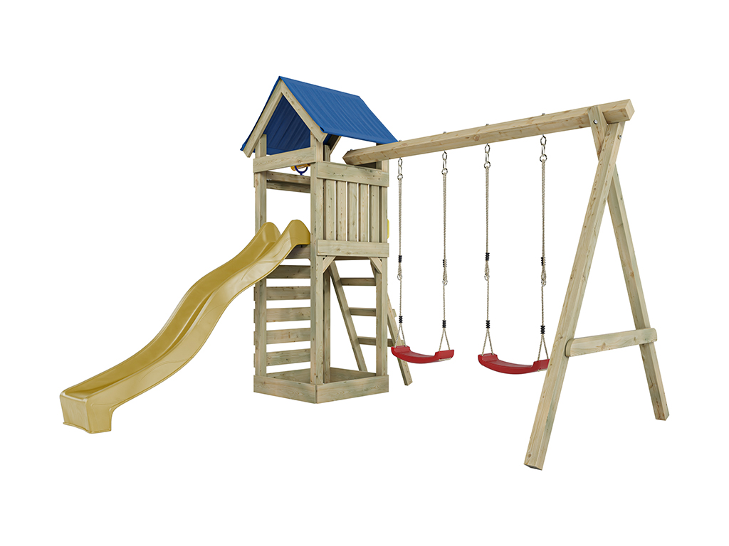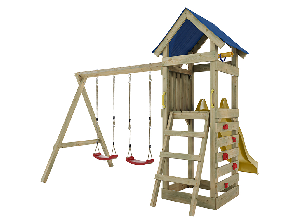 | Leveringsomvang: | Eenvoudige KDI speeltoren, dak van zeildoek, dubbele schommel, 2x schommelzitje of 1x nestschommel (afhankelijk van keuze), 4 schommelhaken, 2 handgrepen, zandbak, ladder, klimwand, klimstenen, 1x telescoop, 1x glijbaan |