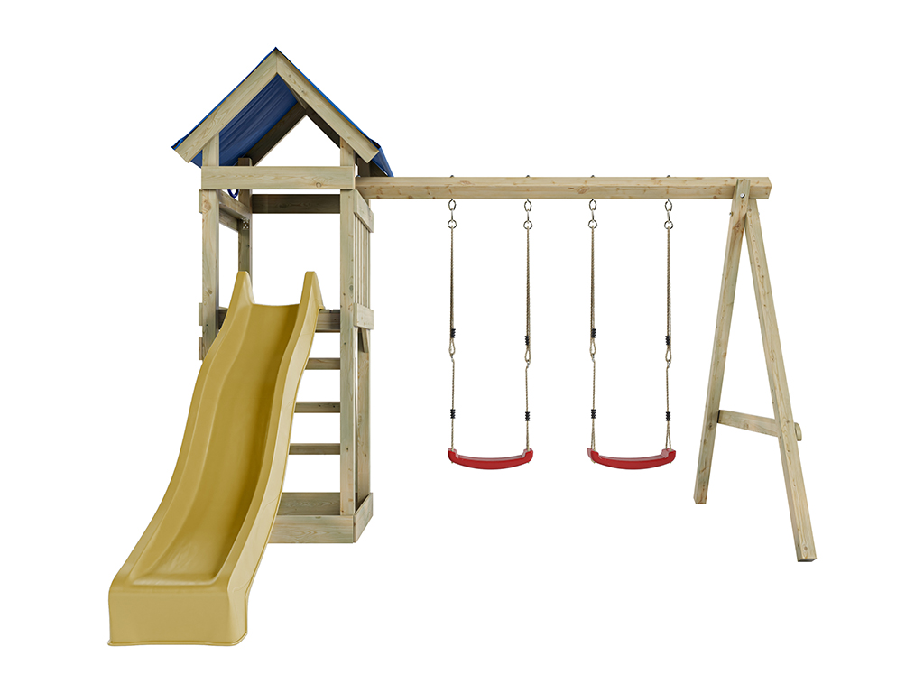 Geïmpregneerde houten speeltoren Easy incl. dubbele schommel incl. gele glijbaan + rode schommelzitj