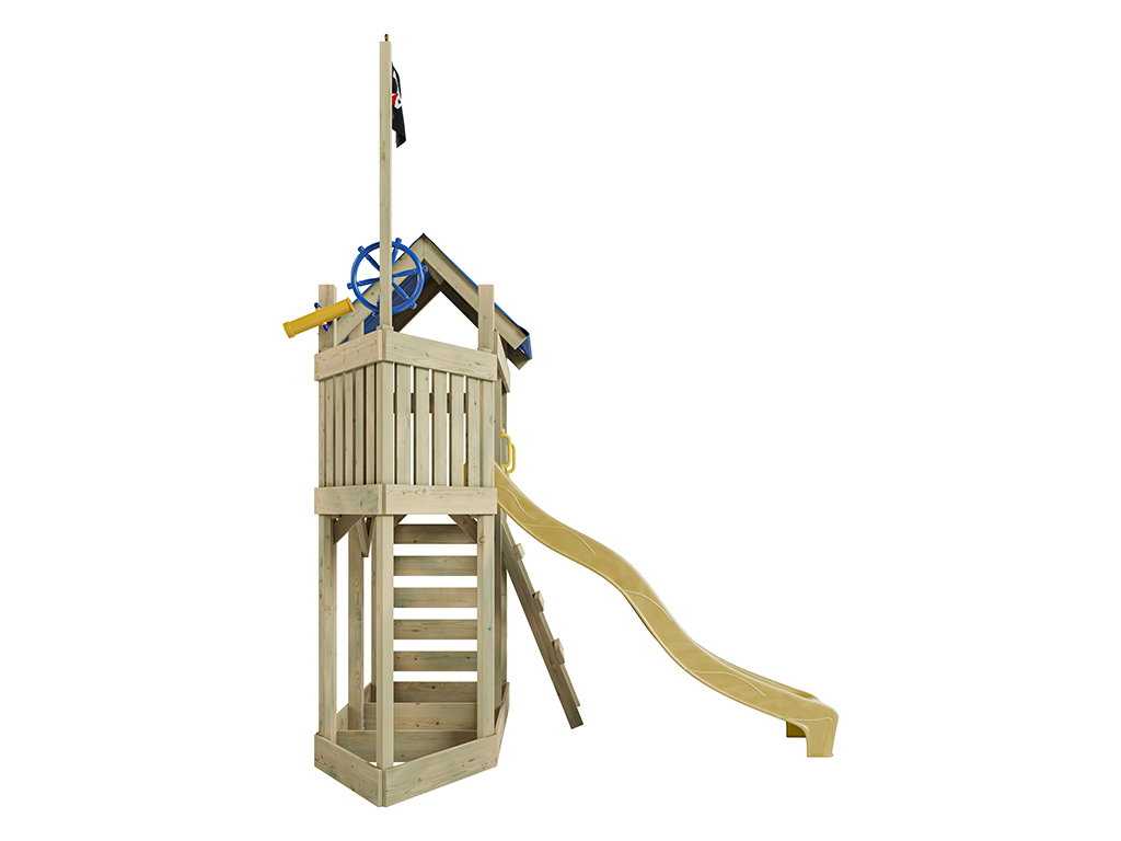 Voor kleine ontdekkingsreizigers en grote piraten biedt deze speeltoren een Captain Jolly-vlag. Deze naam is hét bekende symbool voor alle piraten – al van ver te zien en de droom van ieder kind om eronder te varen. Het grote speelschip met zijn afmetingen van 275 x 229 x 258 cm heeft een dak dat beschermt tegen de “ruwe zee” en nodigt uit om onbekende eilanden te ontdekken, zelfs bij storm. Het uitkijkplatform ligt op een hoogte van 122 cm, perfect om de omgeving te verkennen en rollenspellen te spelen. Aan bakboord (links) zorgt een blauwe glijbaan voor een snelle start in het avontuur. Om weer snel “uit te varen” is er een klimwand aan de achterzijde van het schip en een ladder aan stuurboord.