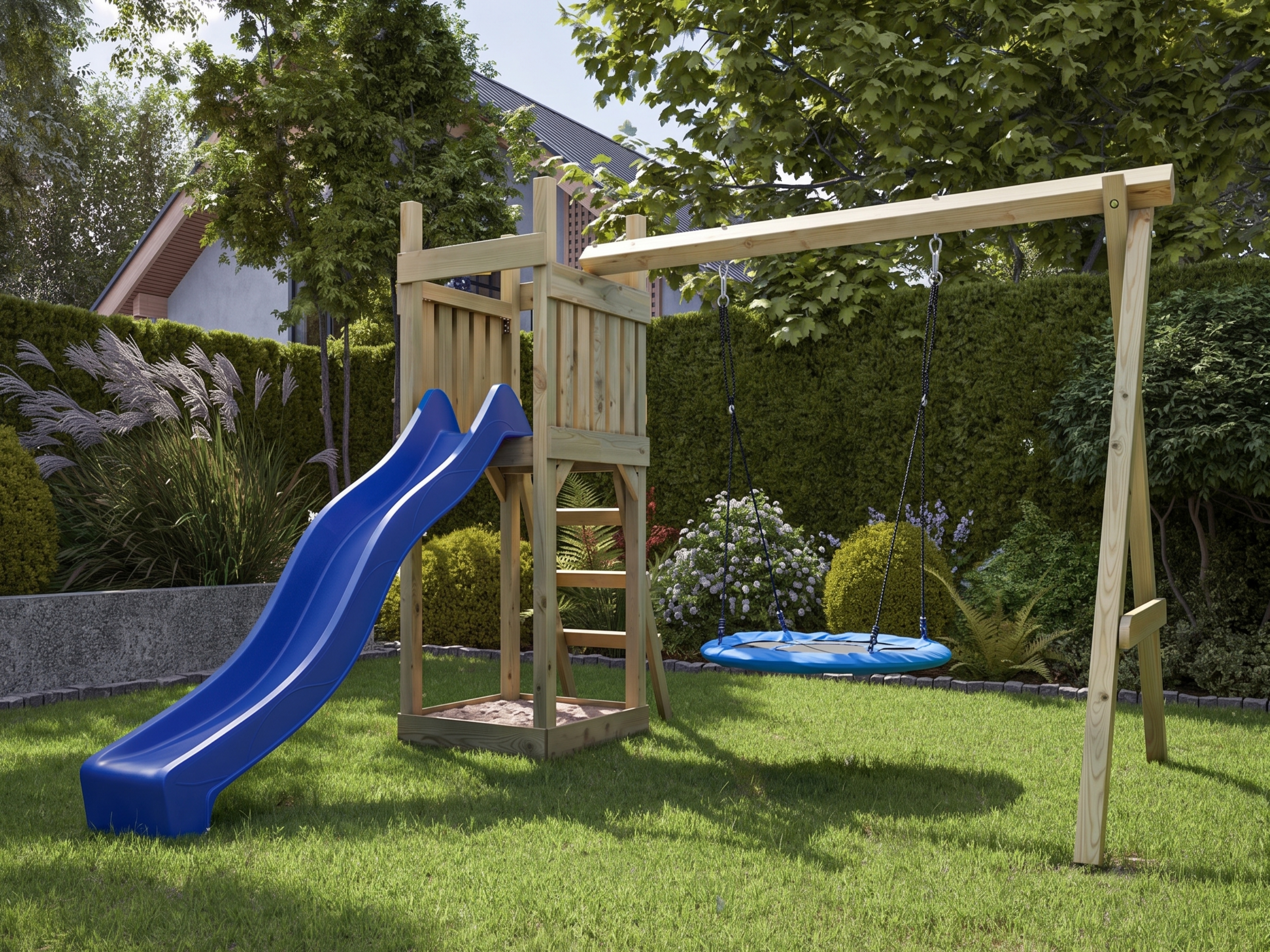 Geïmpregneerde houten speeltoren Skinny incl. dubbele schommel, blauwe glijbaan + nestschommel
