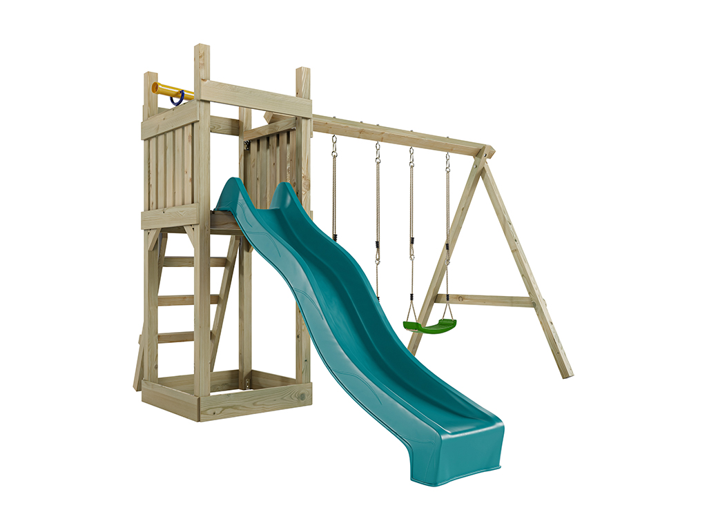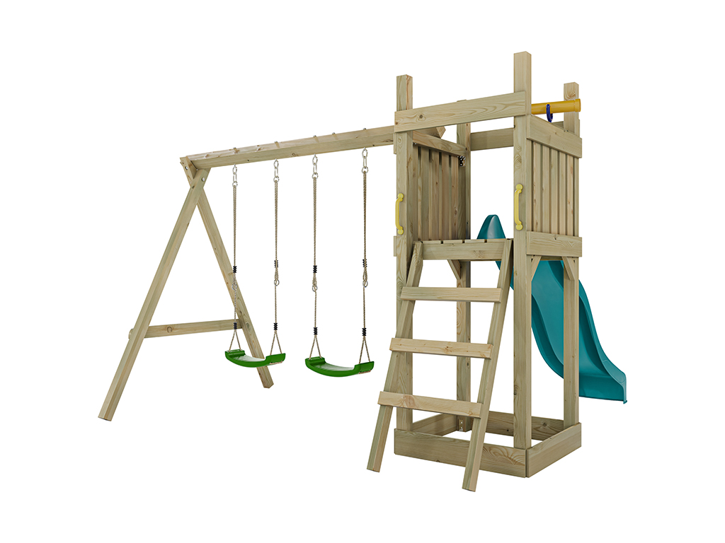 Geïmpregneerde houten speeltoren Skinny incl. dubbele schommel en turquoise glijbaan met groene scho
