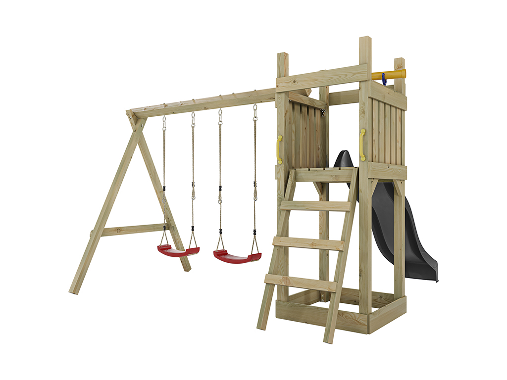 - Speeltoren Skinny geïmpregneerd hout, dubbele schommel, 2x schommelzitje of 1x nestschommel (afhankelijk van de keuze), 4 schommelhaken, 2 handgrepen, zandbak, ladder, 1x glijbaan, ZONDER TELESCOP