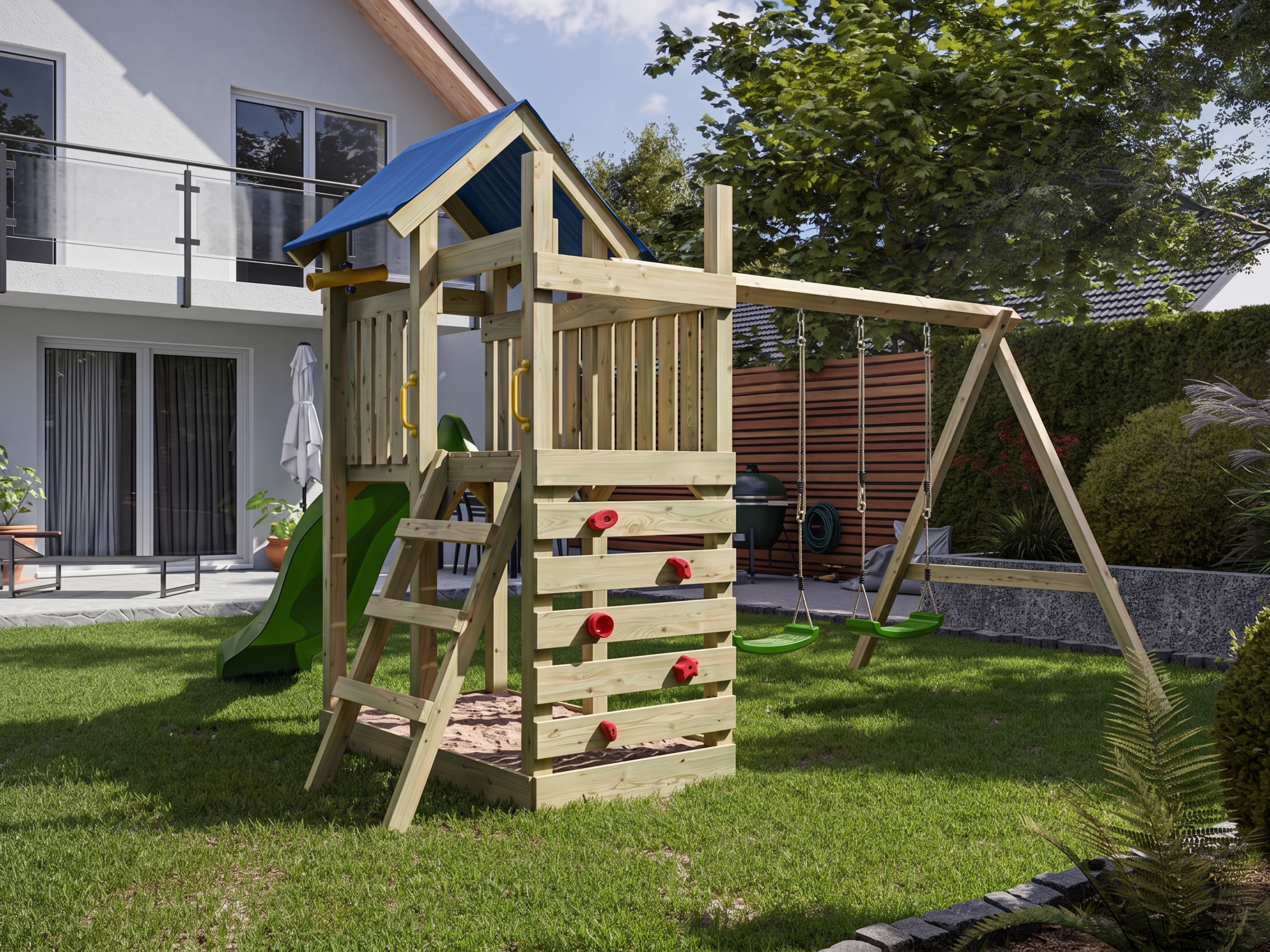 Verder buitenspeelgoed en accessoires, zoals stuurwiel, brievenbus, valdempende tegels enz., zijn optioneel apart bij ons verkrijgbaar.